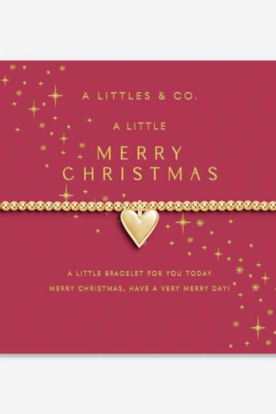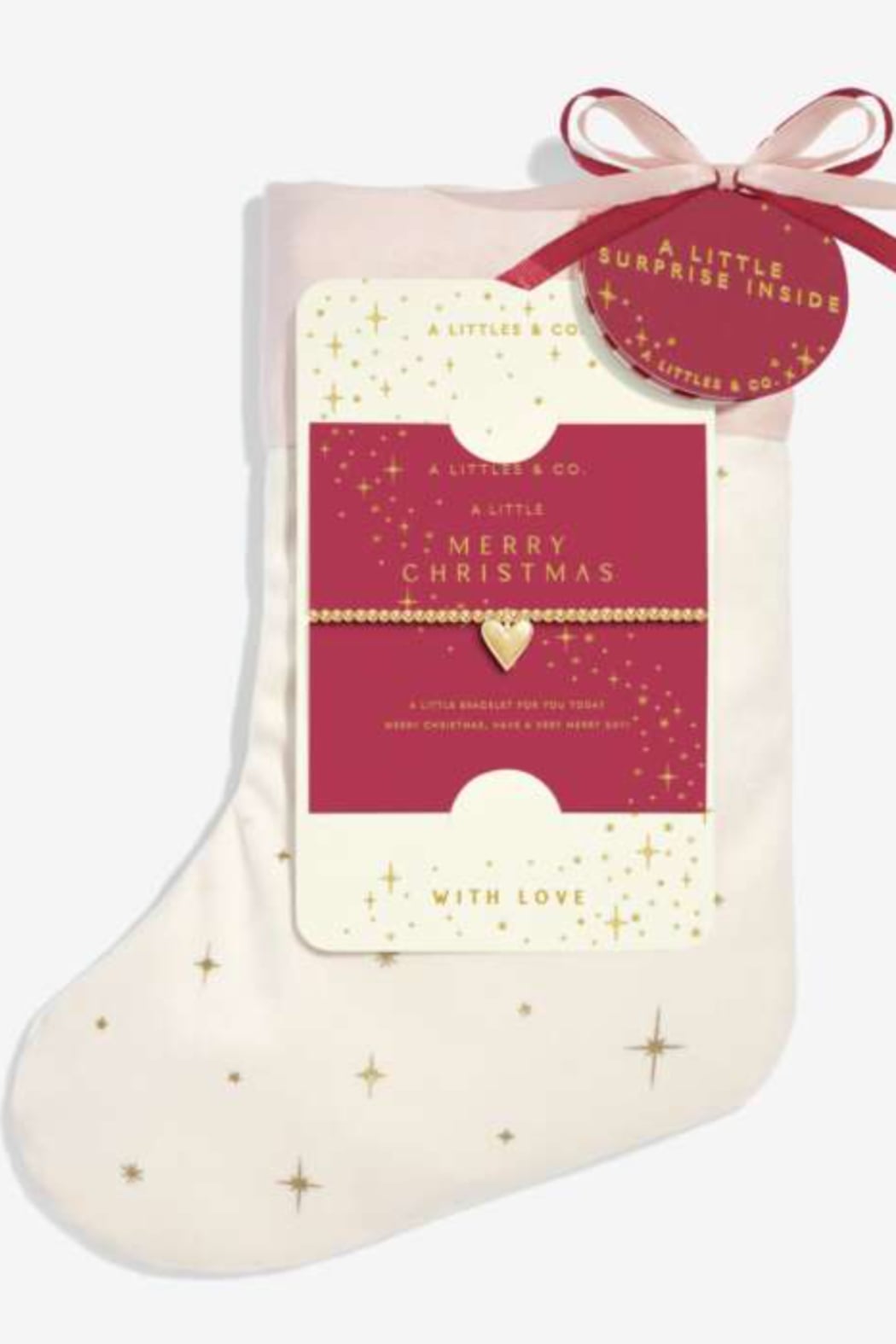 Capture every magical moment this holiday season with our gorgeous Adults' Stocking A Little 'Merry Christmas' Bracelet Gift Set. Perfect for re-using every holiday season, this blush pink velvet stocking is decorated with shining starbursts, tied with a lovely ribbon tag, and paired with our A Little 'Merry Christmas' Bracelet In Gold-Tone Plating. Beautifully boxed and ready to sparkle, this gift set is perfect for celebrating Christmas with loved ones. -Gold-Tone Plated -One Size Fits All -1 A Little Sold Every 30 Seconds Worldwide -Designed In The UK, Customized In The US -Presented on a starburst-print blush velvet Christmas stocking with a ribbon tag