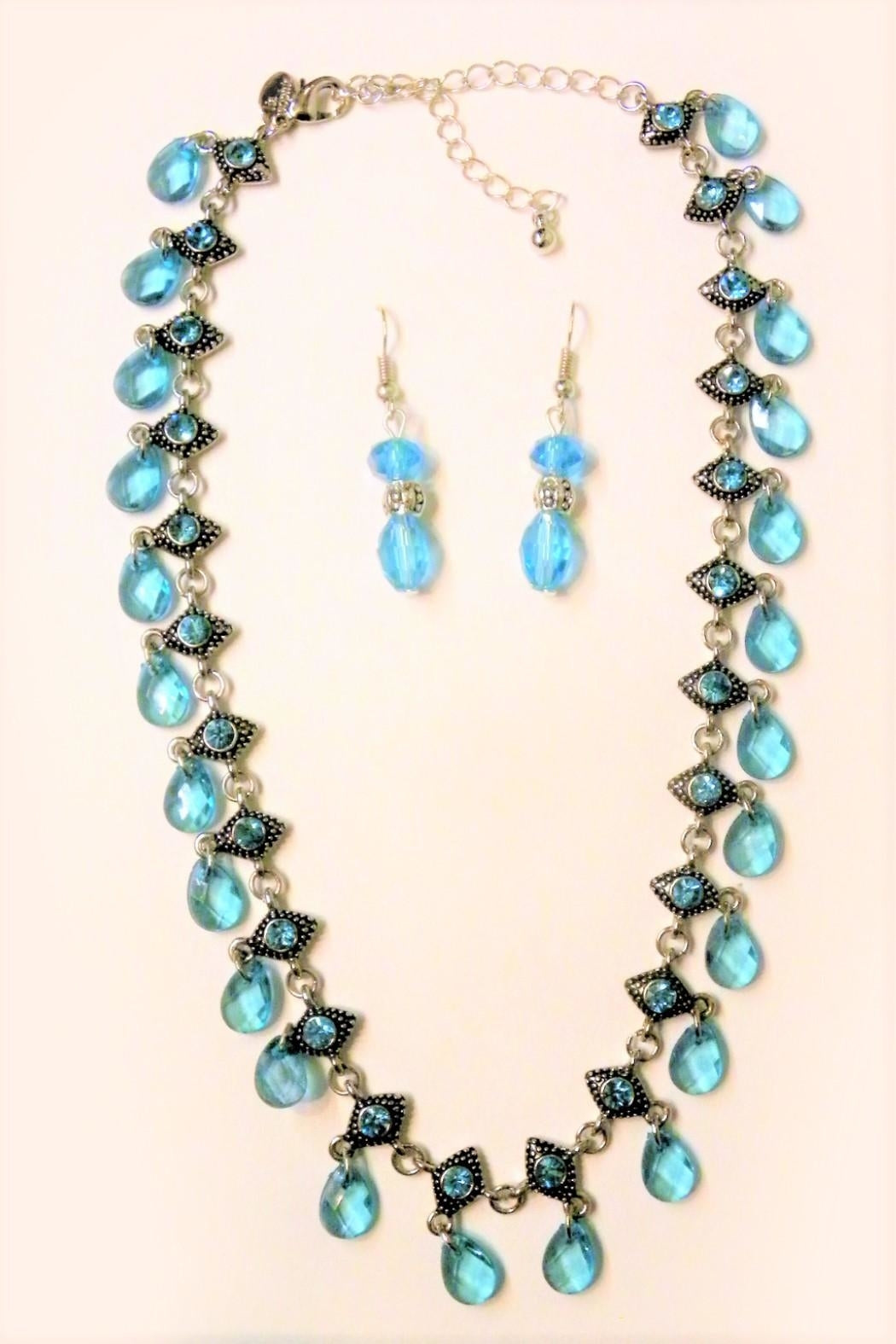 This is the Lia Sophia Aqua Crystal Choker. Made up of of glass and crystal, with antiqued silver tone settings. We hand made matching Swarovski crystal earrings with stainless steel hooks to perfectly match it. Try as we may we just couldn't get a picture to do it justice. This set would be perfect for a special occasion! You'll get the set for less than what you would expect to pay just for the handmade crystal earrings! These items comply with safety regulations of lead, nickel and other components. Comes gift boxed. Find other moderately priced jewelry on the Mimi's Gift Gallery boutique page. Measurements: 14" necklace plus 3.5" extender. Earrings total 2" in length.