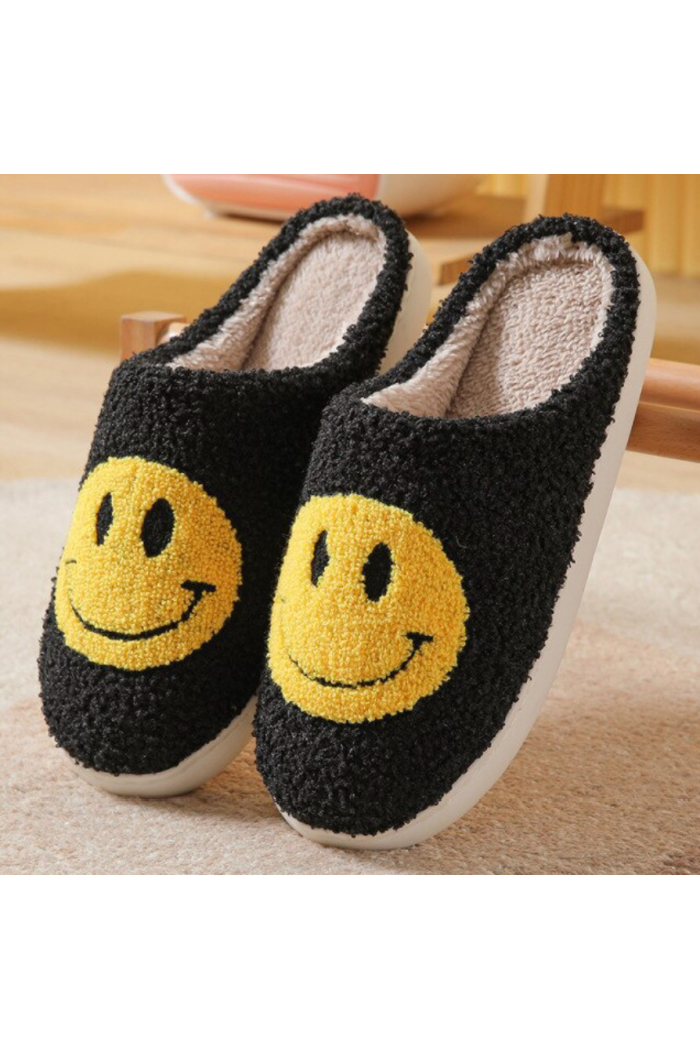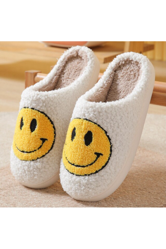 Super comfy cozy warm smiley face faux fur slipper with rubber bottoms.