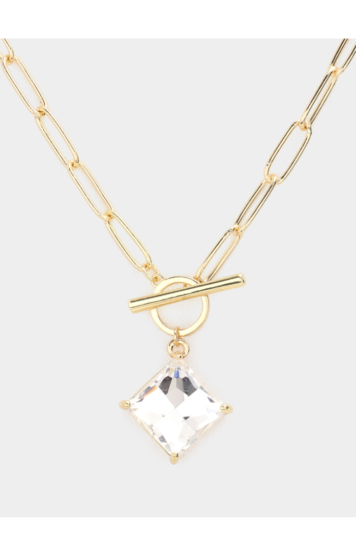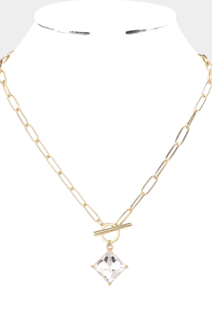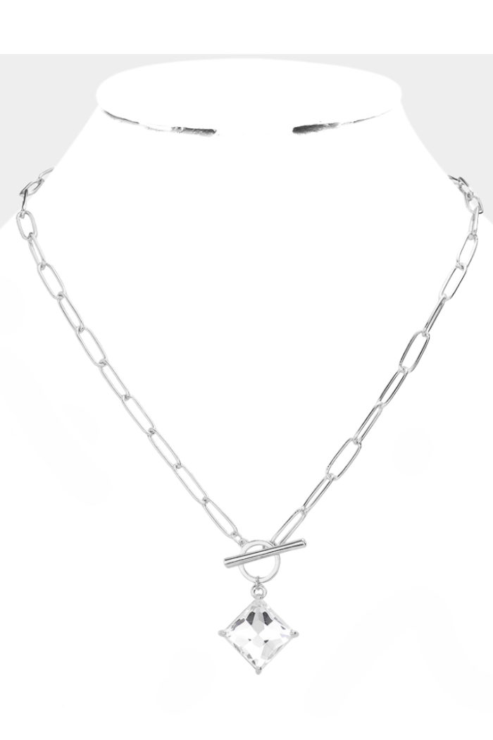 Adjustable 17-20” gold or silver hypoallergenic Metal alloy paper clip link necklace with front toggle and lobster claw closure. Stone is approximately 12mm