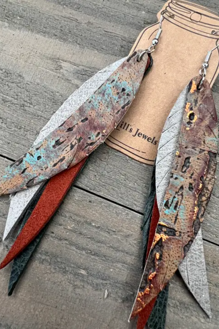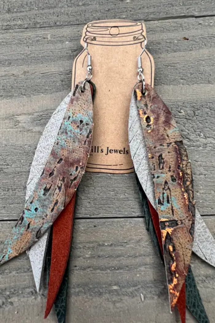 This is a pair of stacked leather earrings with a feather fringe pattern.