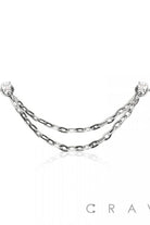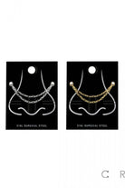 Delicate L-shaped nose rings wired with two graceful chains for a layered look. The CZ L-Shape Nose Rings with Double Chain feature sparkling cubic zirconia stones set in a gold-tone finish for subtle shine. Crave Body Jewelry designs this piece to drape elegantly from a nostril stud, adding a contemporary, slightly edgy accent to everyday wear. Lightweight and eye-catching, it’s ideal for dressing up casual looks or complementing evening styles. GEM WITH DOUBLE NOSE CHAIN 316L SURGICAL STEEL. Material: 316L SURGICAL STEEL/Alloy, Thickness: 20GA (0.8MM), Chain Length: 30MM/ 40MM, Ball size: 2MM