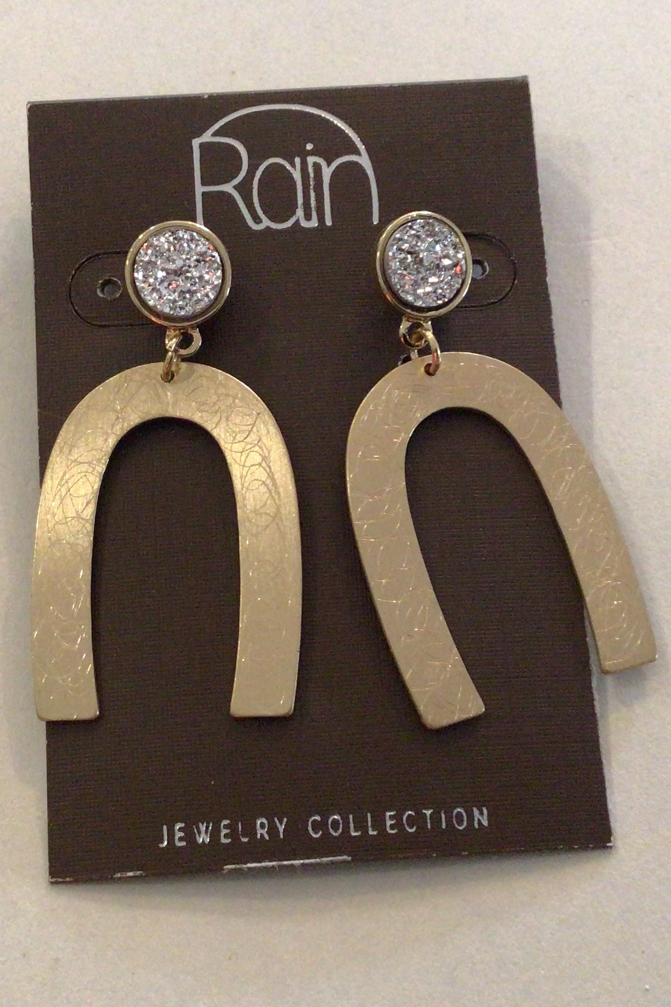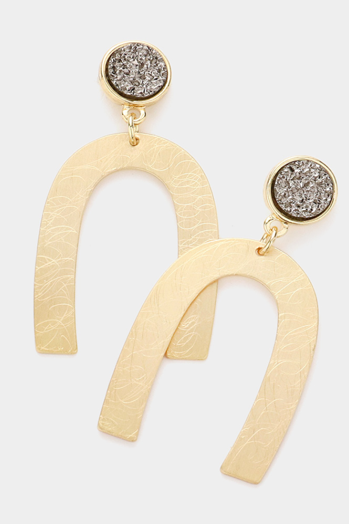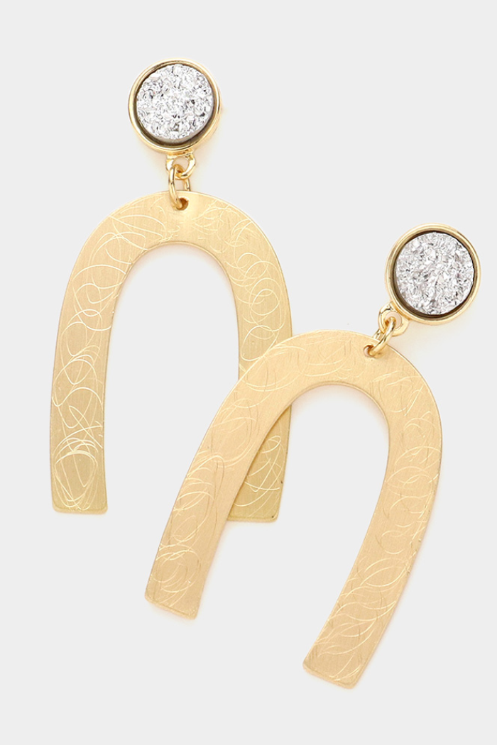 Yellow Gold Matte Scratched Finish U shape Dangle with approx 10 mm round druzy stones in 2 colors.
