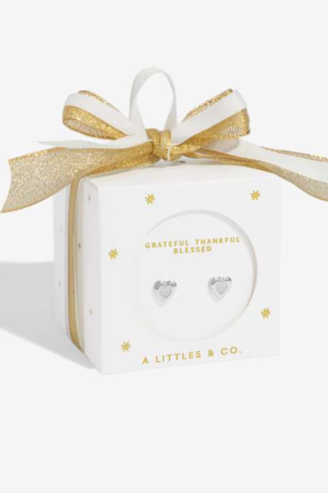 Crowned with silver-plated hearts to represent your love this season and spread joy at Christmas, say hello to our 'Grateful, Thankful, Blessed' Earring Bauble In Silver Plating. In a ribbon-tied hanging gift box, featuring a wonderful festive starburst print, these boxed earrings make the perfect stocking stuffer and are sure to shine bright hanging from the tree!