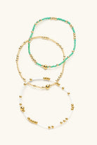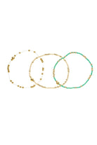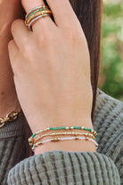 Add a pop of color with this Emerald Beaded Bracelet Set, crafted in waterproof 14k gold-plated stainless steel. Each elastic bracelet stretches to fit any wrist, making it effortlessly chic and comfortable. Sold as a set of three, the mix of gold accents and vibrant emerald beads brings a playful yet luxe touch to every look. Perfect for day-to-night styling, weekend brunches, beach days, or layering up for festival-ready vibes.