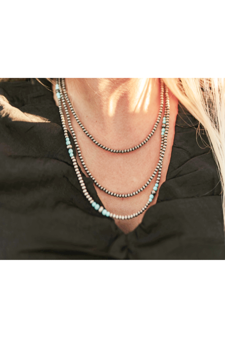 Style effortlessly with our Faux Navajo Pearl and Turquoise Layered Necklace. Classic faux pearls meet vibrant turquoise for a look that's both timeless and trendsetting. Versatile and chic, this necklace is your go-to for any occasion. Southwest vibes, modern charm – it's the perfect blend in one captivating piece!
