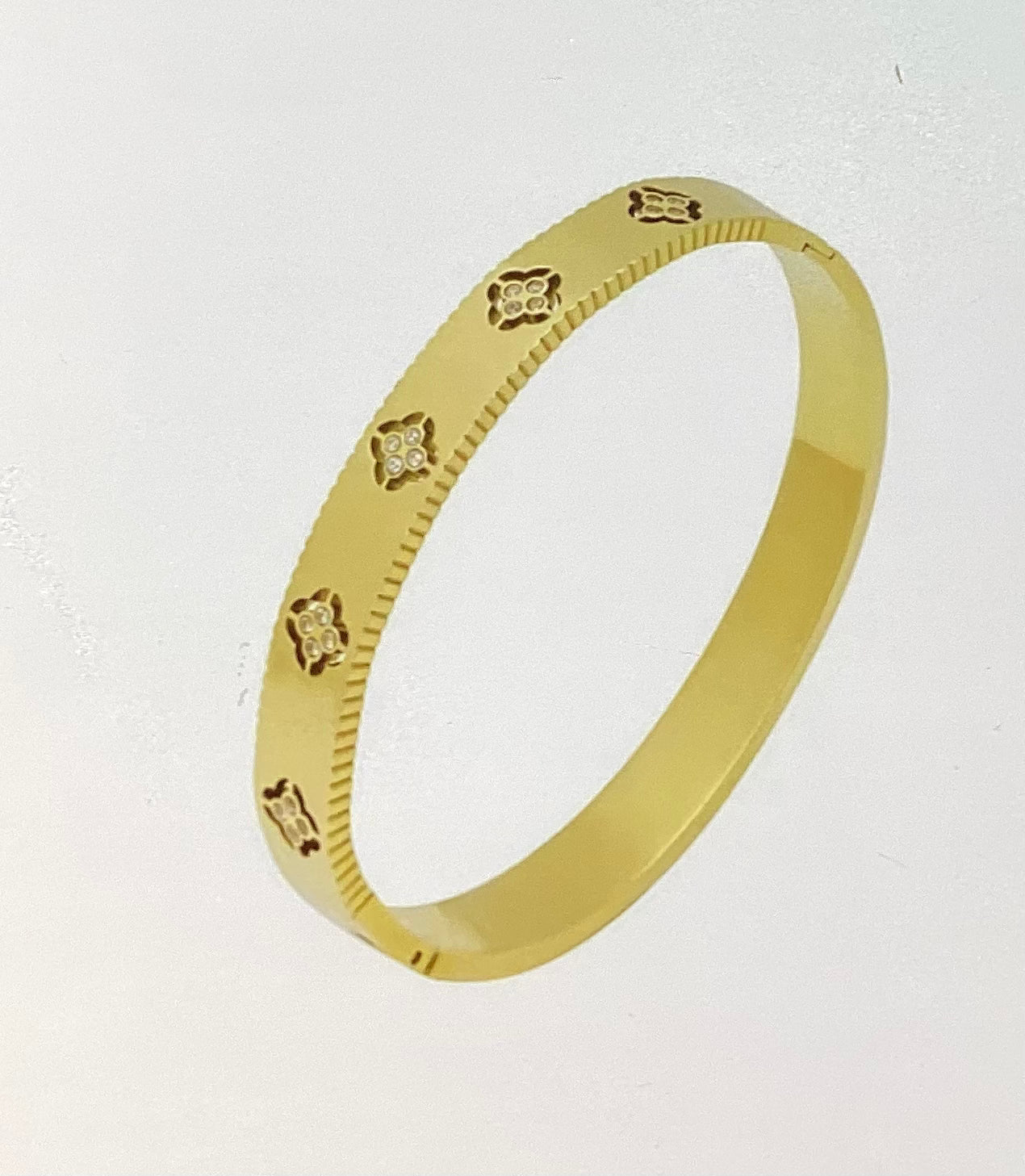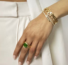 Elevate your stack with a timeless edge. The Georgina Bracelet features a sleek, high shine gold finish accented with raised emblem details. From brunch to cocktails, the Georgina is your go-to bangle for effortless statement style.