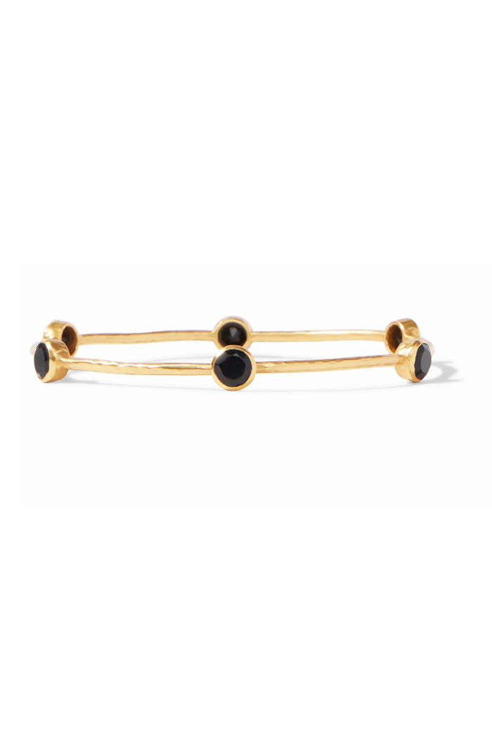 A lightly hammered bangle features six circular gemstones that sit along the length of this slim bangle, making it perfect for mixing and matching to create a striking color story on your wrist. Dimensions: Small 2.5 inches, Medium 2.6 inches, Large 2.7 inches 24K gold plate