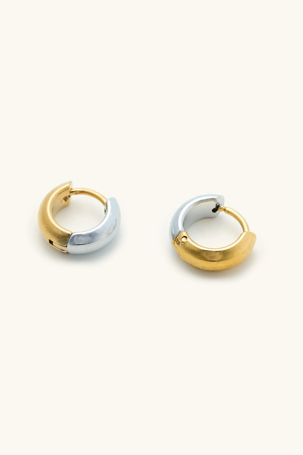 Your stack's new favorite—small hoops, big style. These Mini Two Toned Huggies blend warm 14k gold with cool stainless steel for an effortless mixed-metal look that plays with everything you own. Shower-safe, sweat-friendly, and made for daily rotation. Perfect for work-to-weekend outfits, minimalist looks, or gifting when you don't know their metal preference. Features: - Waterproof: Stainless steel and 14k gold - Size: 6 mm - Huggie closure
