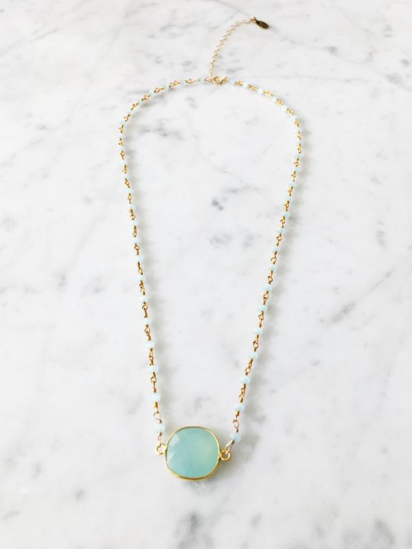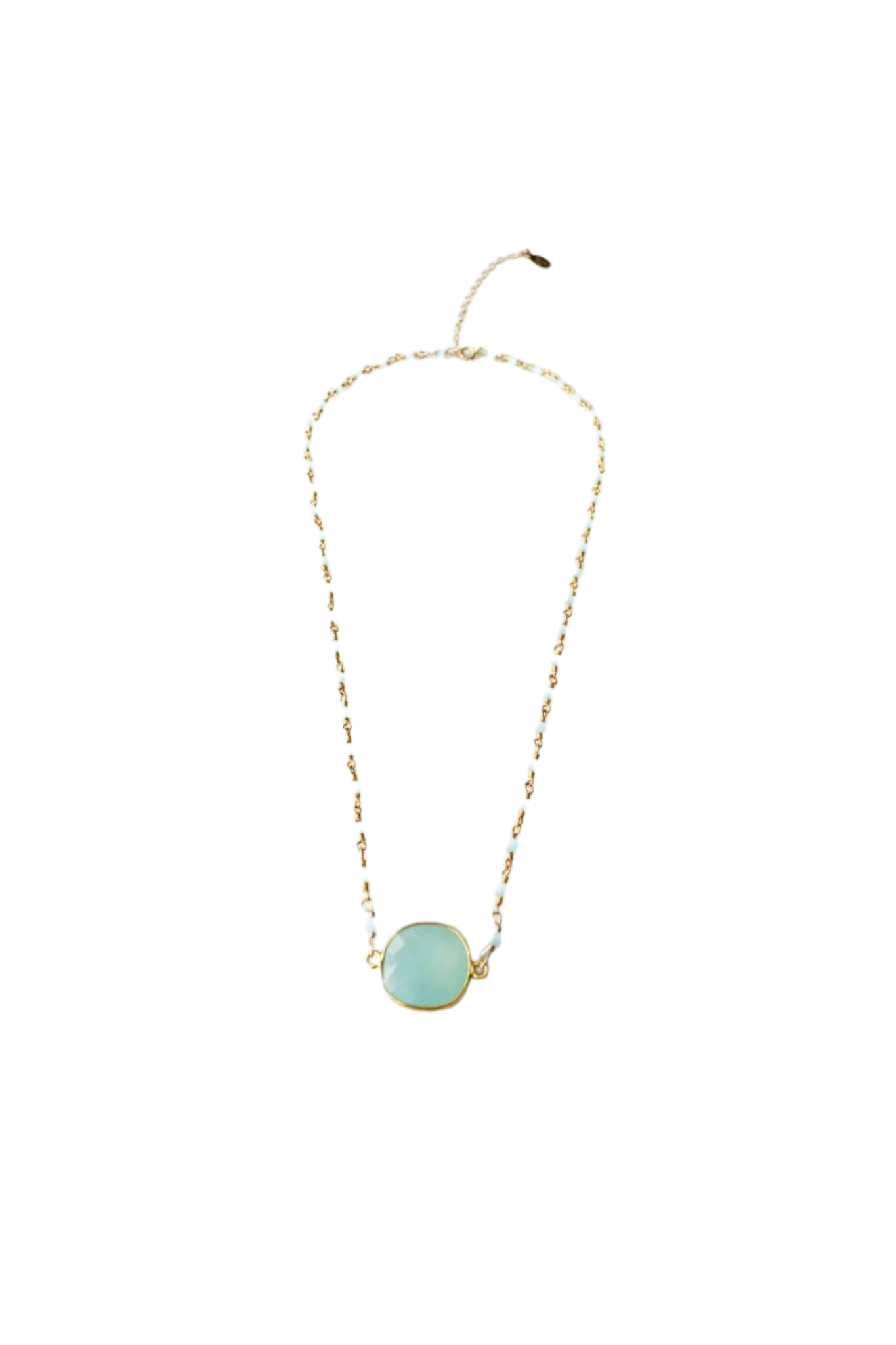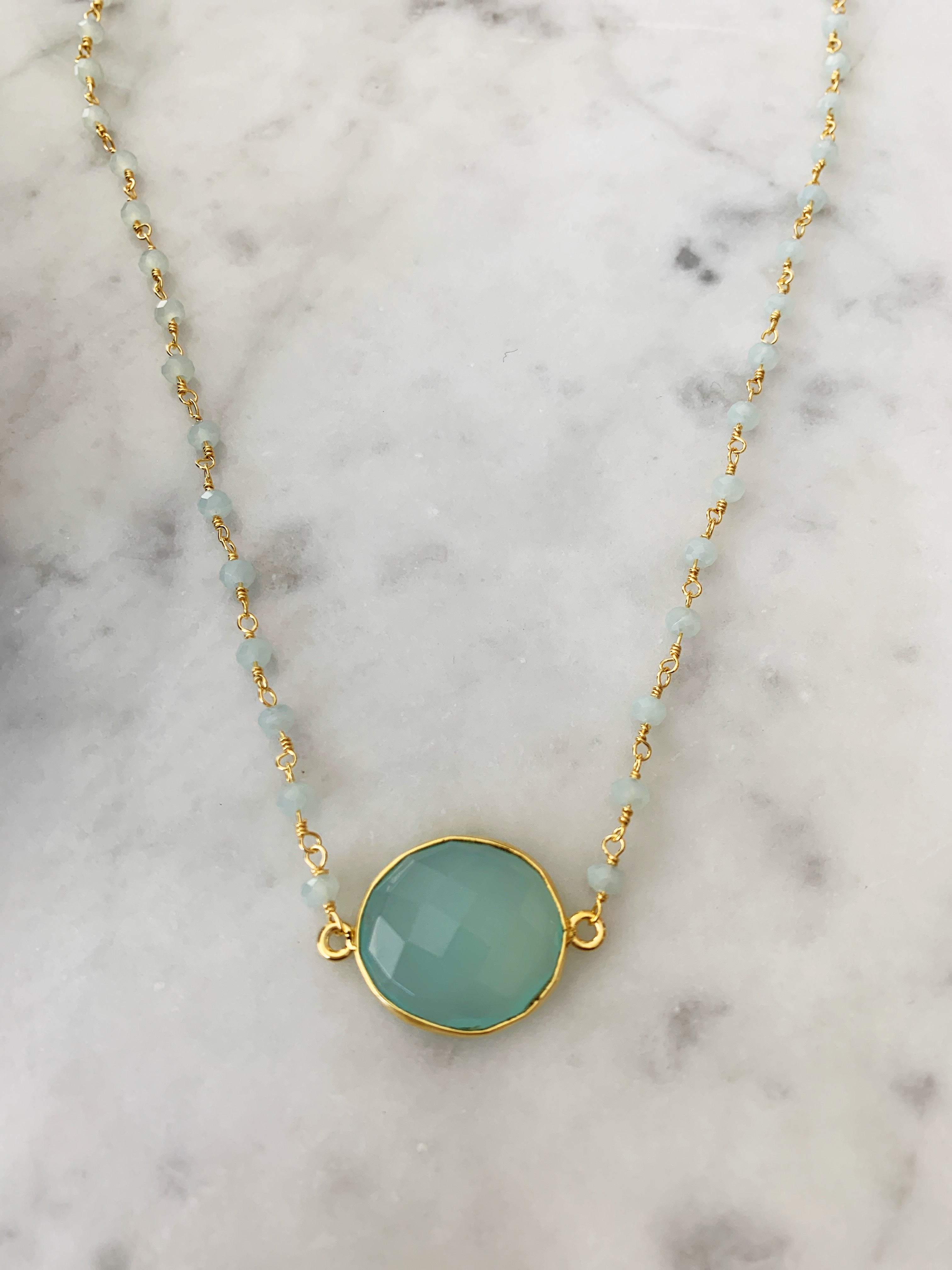 A semi-precious chalcedony stone set in a 14k gold filled bezel sitting on a semi-precious chalcedony beaded gold chain with a 14k gold filled clasp.