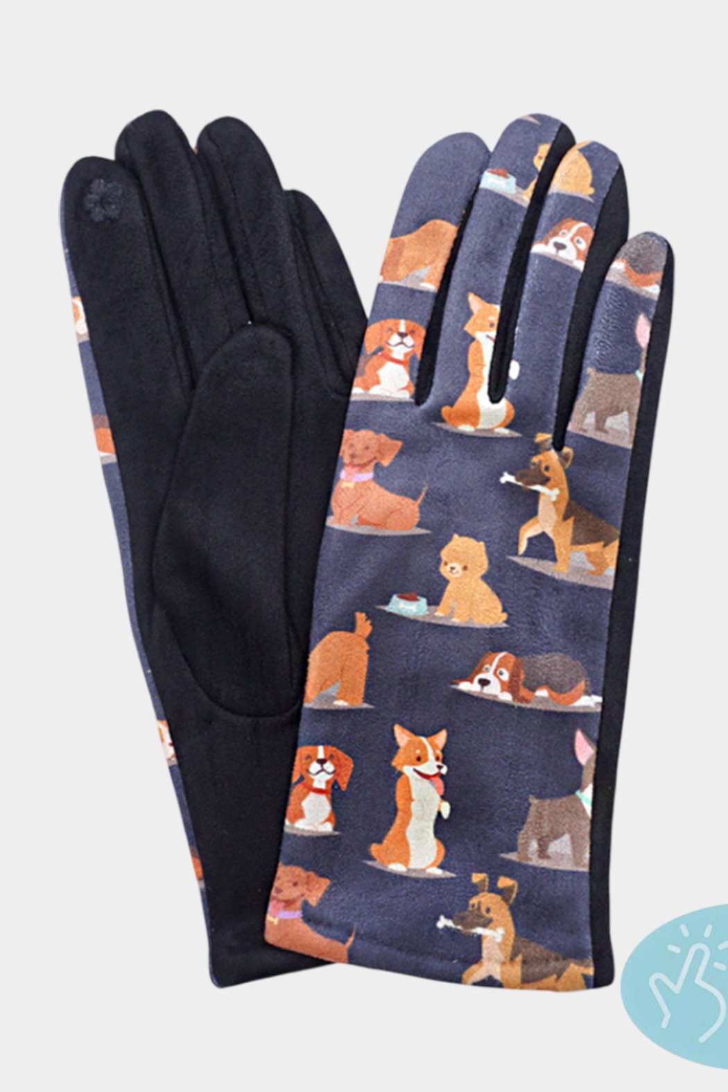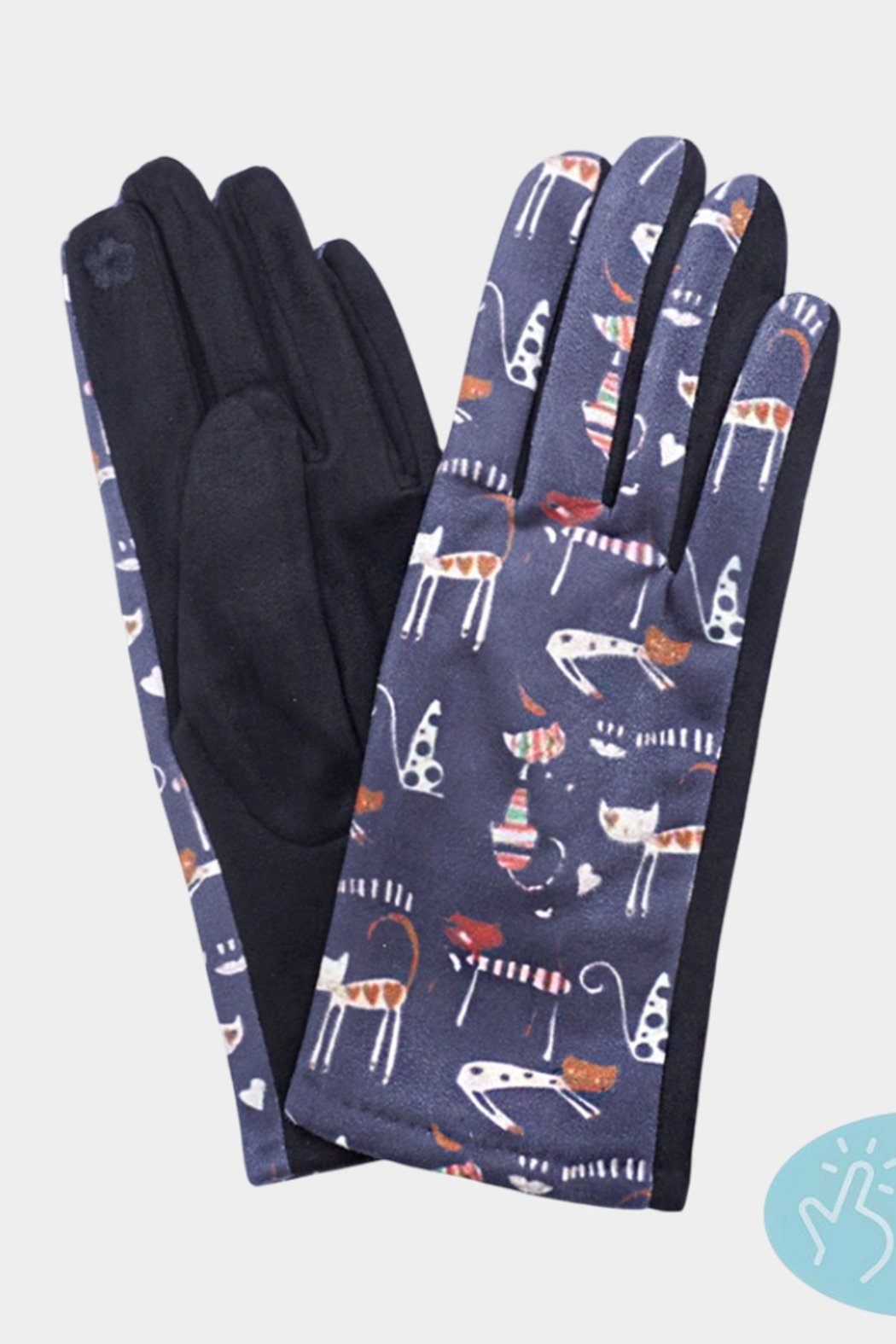 Super Soft Stretchy Smart Touchscreen Gloves with Cats or Dogs. Both are black with different colors for the animals