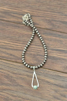 Natural Turquoise Pendant, Necklace * Natural stone may vary in size, color or shape * 16" long necklace & 5" extender * 0.4" (8mm) navajo pearl necklace * 2" long natural turquoise pendant laid on alloy * 30 grams weight * Antique silver plate * Nickel, Lead & Chrome free