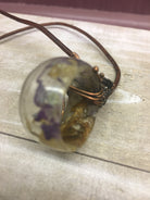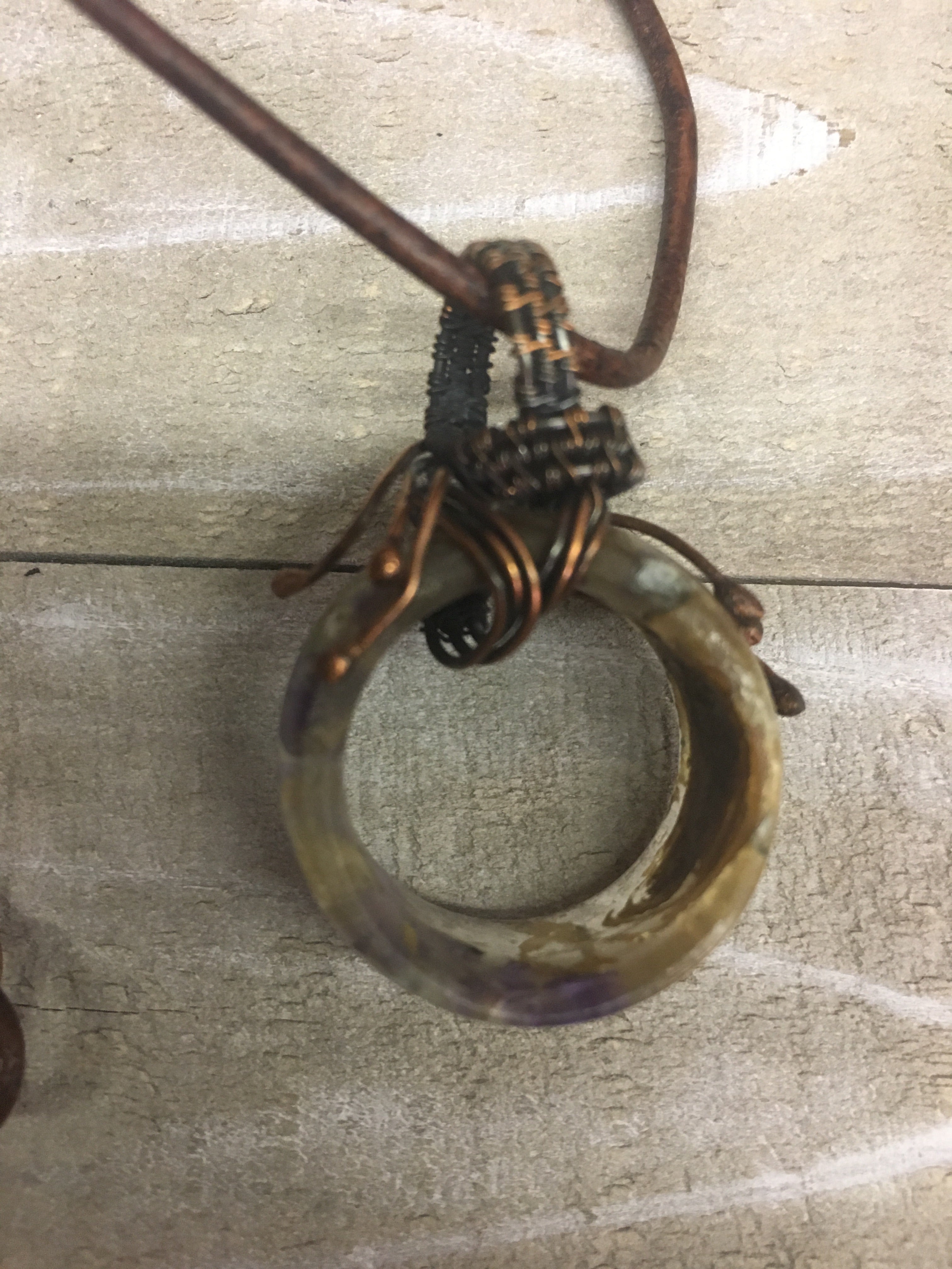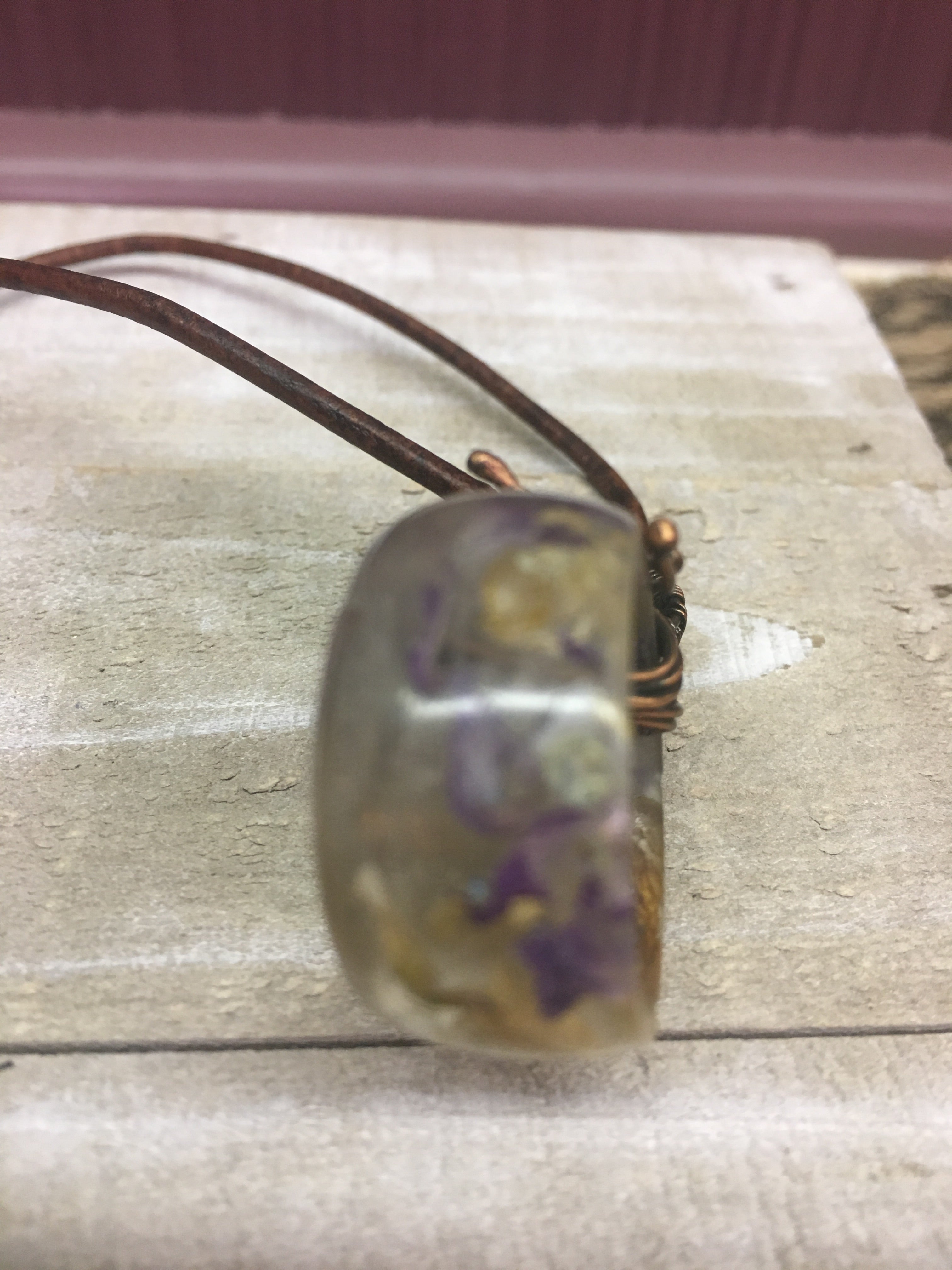 Resin with dried flowers and wood pieces, wire-wrapped.