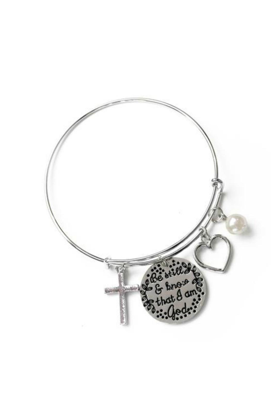 A perfect gift for a friend or loved one! This bangle simply states "Be still & know that I am God" in the center of a circular pendant, which is a quote from Psalm 46:10. Pendant and bracelet are all silver tone solid stainless steel. Also has a cross charm, a heart charm and a faux pearl. Bracelet is adjustable by simply pulling apart or pressing together. It will be a comfort to any believer! Comes gift boxed. Nickel and lead compliant. Find more moderately priced inspirational jewelry on the Mimi's Gift Gallery boutique page. Dimensions: The pendant is 1" across. The diameter of the bracelet presently is 2.75".