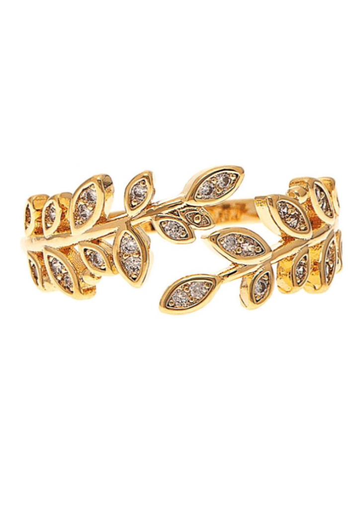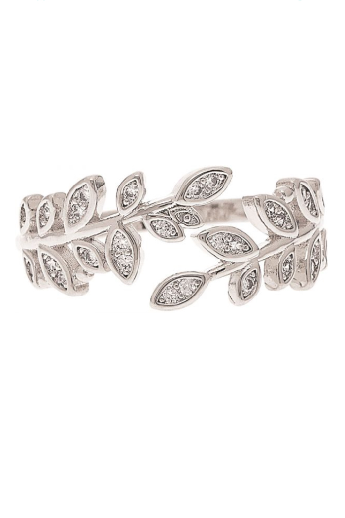 Adjustable Open Leaf Cubic Zirconia Ring in Gold or Silver. Fits size 5-8