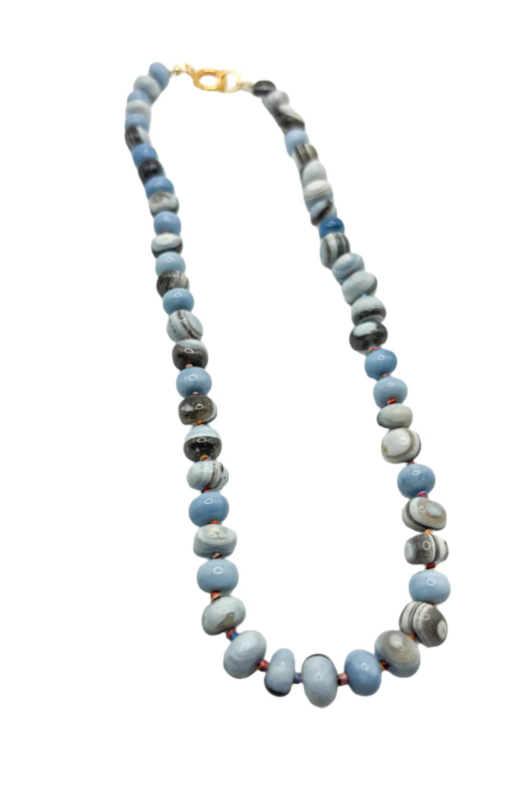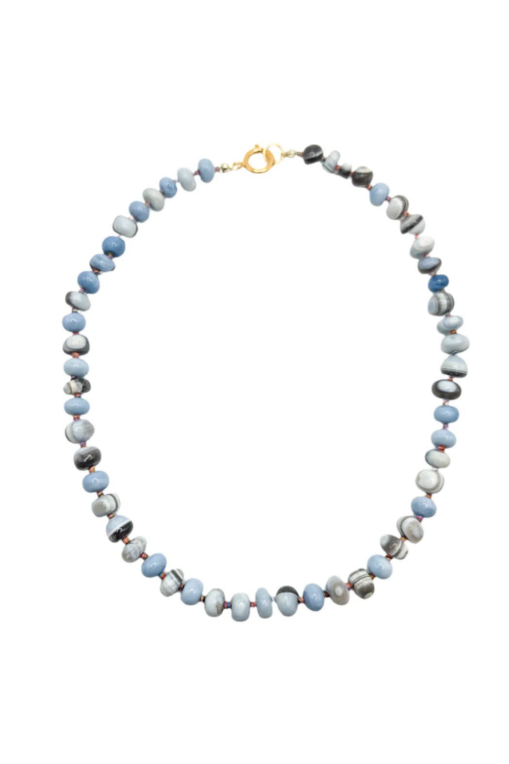 An ocean-inspired statement with timeless craftsmanship, this hand-knotted necklace features 8 mm rondelle-style dyed blue opals, each bead uniquely iridescent and full of depth. Finished with a 14k gold-filled sailor clasp, it strikes the perfect balance between effortless luxury and artisanal charm. Perfect for coastal getaways, dinner al fresco, or adding a pop of color to your everyday gold stack. Features: - Hand-knotted necklace made with 8mm rondelle-style dyed opals. - Approximately 16" in length - 14k gold-filled sailor clasp