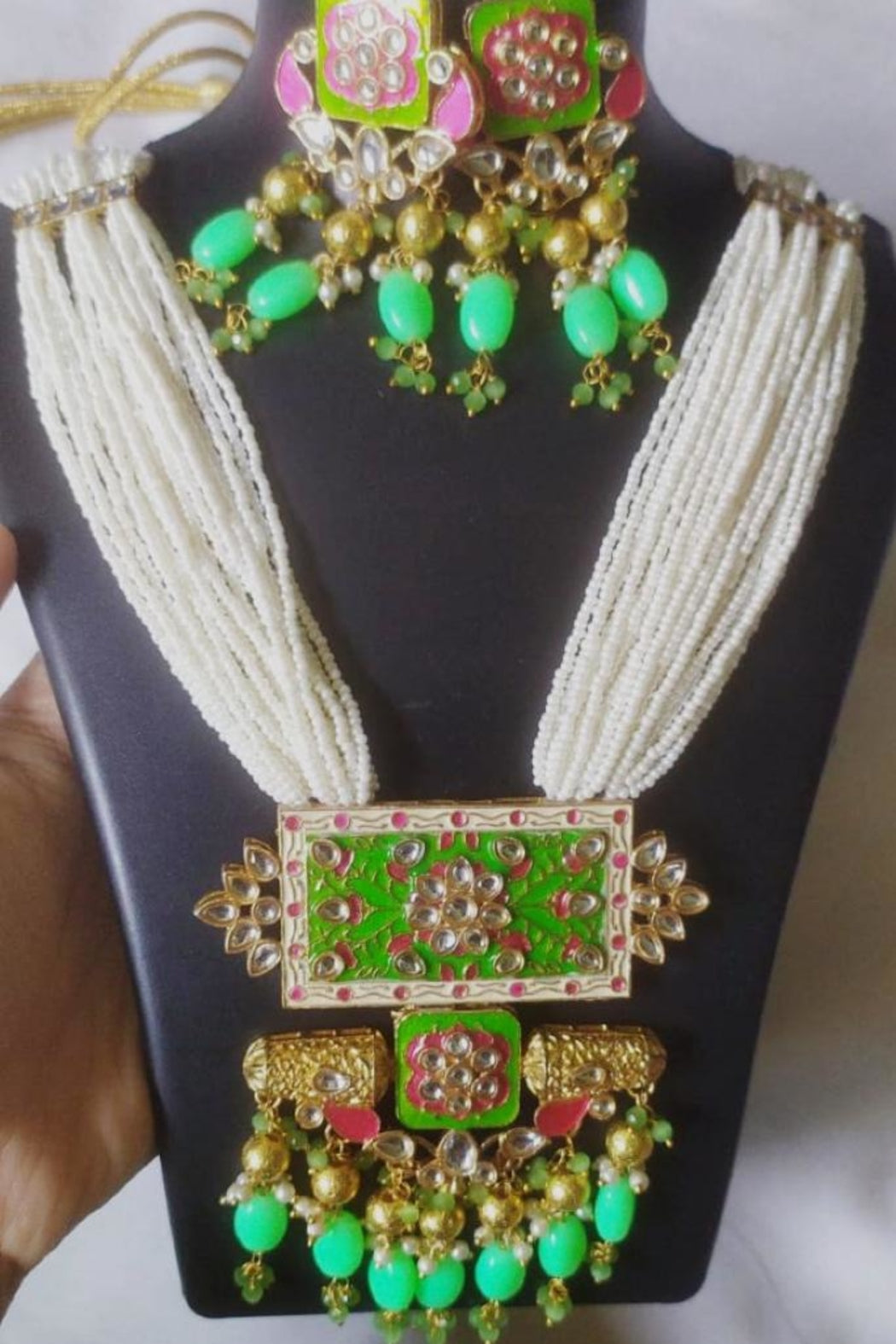 Beautiful Traditional Long Necklace Set with Small Pearls Color - White, Green and Pink One Piece Available With Matching Earrings