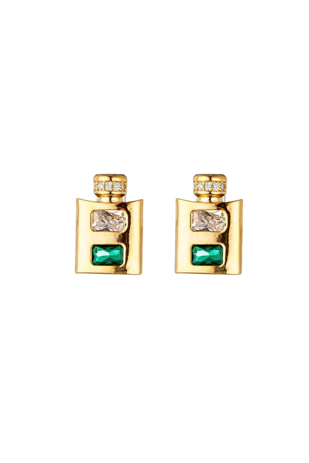 Be the life of the party in style with the Whiskey Flask Stud Earrings. Featuring a golden flask design adorned with brilliant clear and green glass crystal stones, these earrings are perfect for parties, festivals, or everyday fun and games. Product Details | Metal: Brass, Stone Type: CZ Measurements: Approx. 1" * Closure: Pushback
