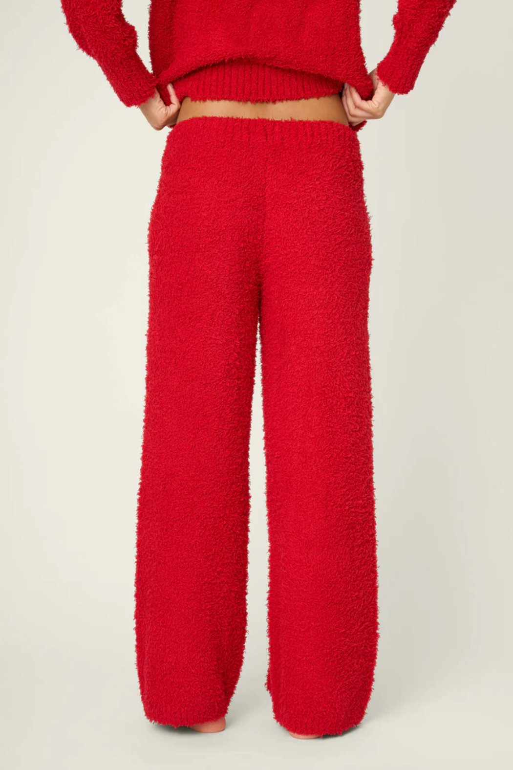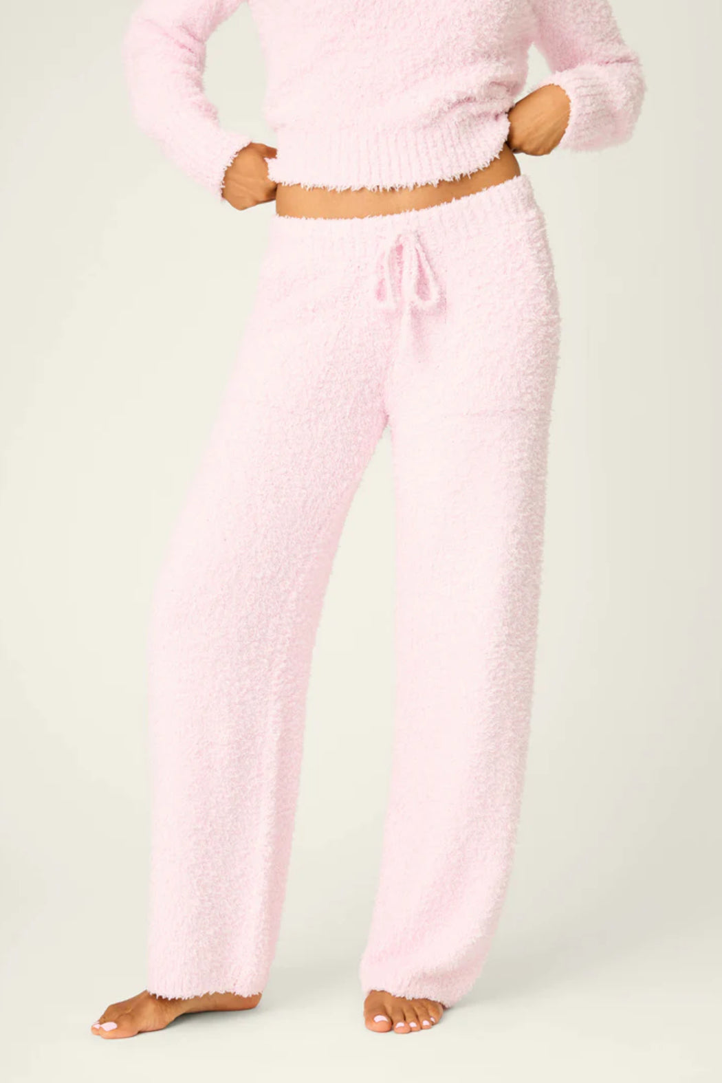 Soft boucle lounge pants with an open, wide leg silhouette designed for relaxed days at home. The Bundle Up Boucle Pink Open Leg Pants feature a fuzzy texture and drawstring waist for a cozy, comfortable fit, side pockets. PJ Salvage crafted these in a plush knit that pairs perfectly with the matching top or layered over pajamas. Wear them for lounging, low-key errands, or chilly evenings in. Machine Wash Cold. Do Not Bleach. Tumble Dry Low.
