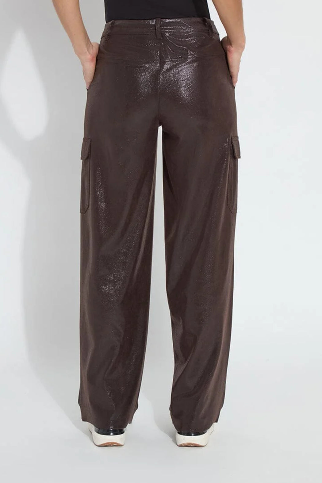 Made from 4-way stretch, easy-care fabric, the Callie Patent Foil Vegan Suede Cargo Pant are relaxed and slouchy. Detailing includes low-placed side pockets for a slimmer silhouette, a raw-edge hem for simple alterations and a wide leg. The Callie Patent Foil Vegan Suede Cargo Pant also offers a clean front, belt loops, patch pockets, a back yoke and waist seam, and a concealed patented waistband. Lyssé concealed patented 360° smoothing waistband