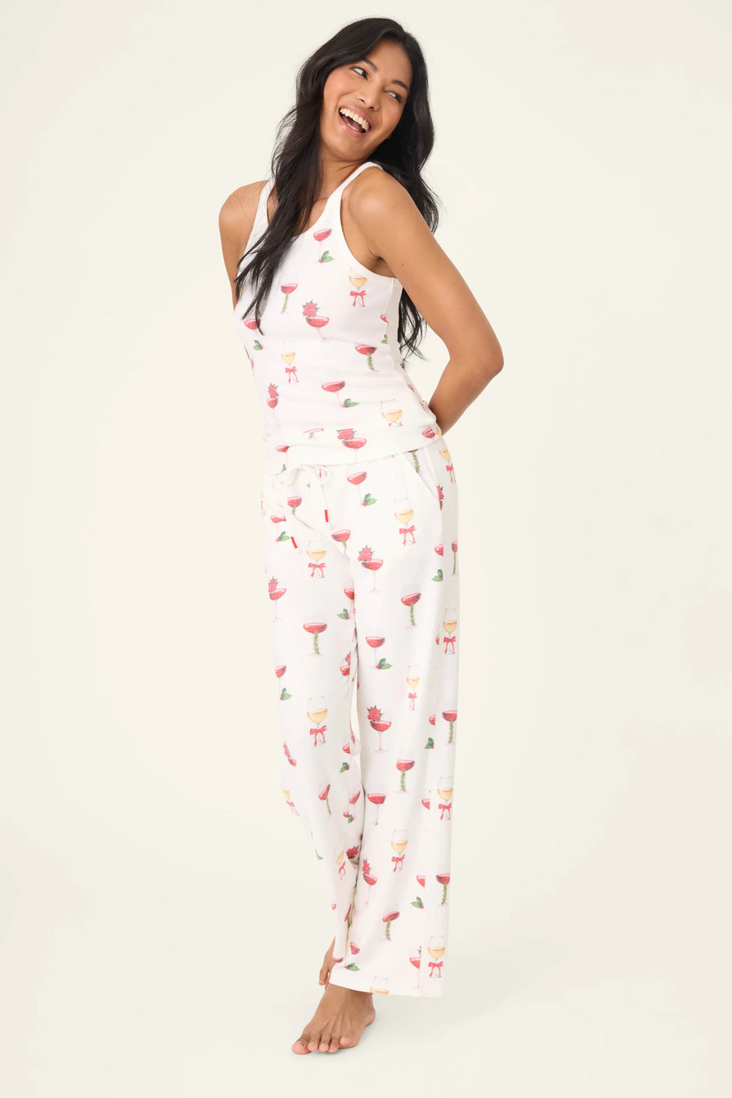 A lightweight ribbed tank printed with festive wine glass motifs, perfect for lounging or holiday pajama sets. The Let's Get Toasty Holiday Wine Print Tank Top features a scoop neckline and sleeveless cut for an easy, relaxed fit. Soft cotton-blend fabric and a fitted tank silhouette make it comfortable for cozy evenings at home. This style is offered by PJ Salvage and pairs perfectly with the matching printed lounge pants. Turn Garment Inside Out. Machine Wash Cold. Do Not Bleach. Lay Flat to Dry.