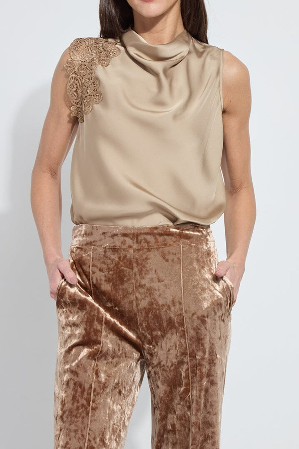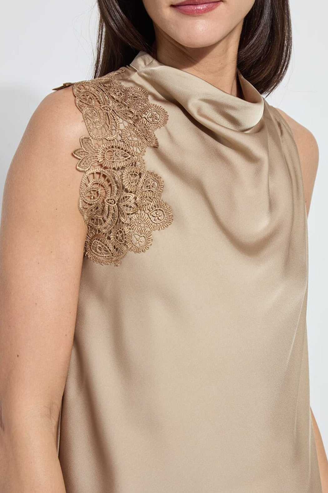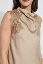 Made from Soft Touch Satin, the bias cut Teresa Guipure Lace Trim Shell showcases lace applied over one sleeve, a draped funnel neck, back keyhole with self-covered button, and self-bias binding at the arm holes.