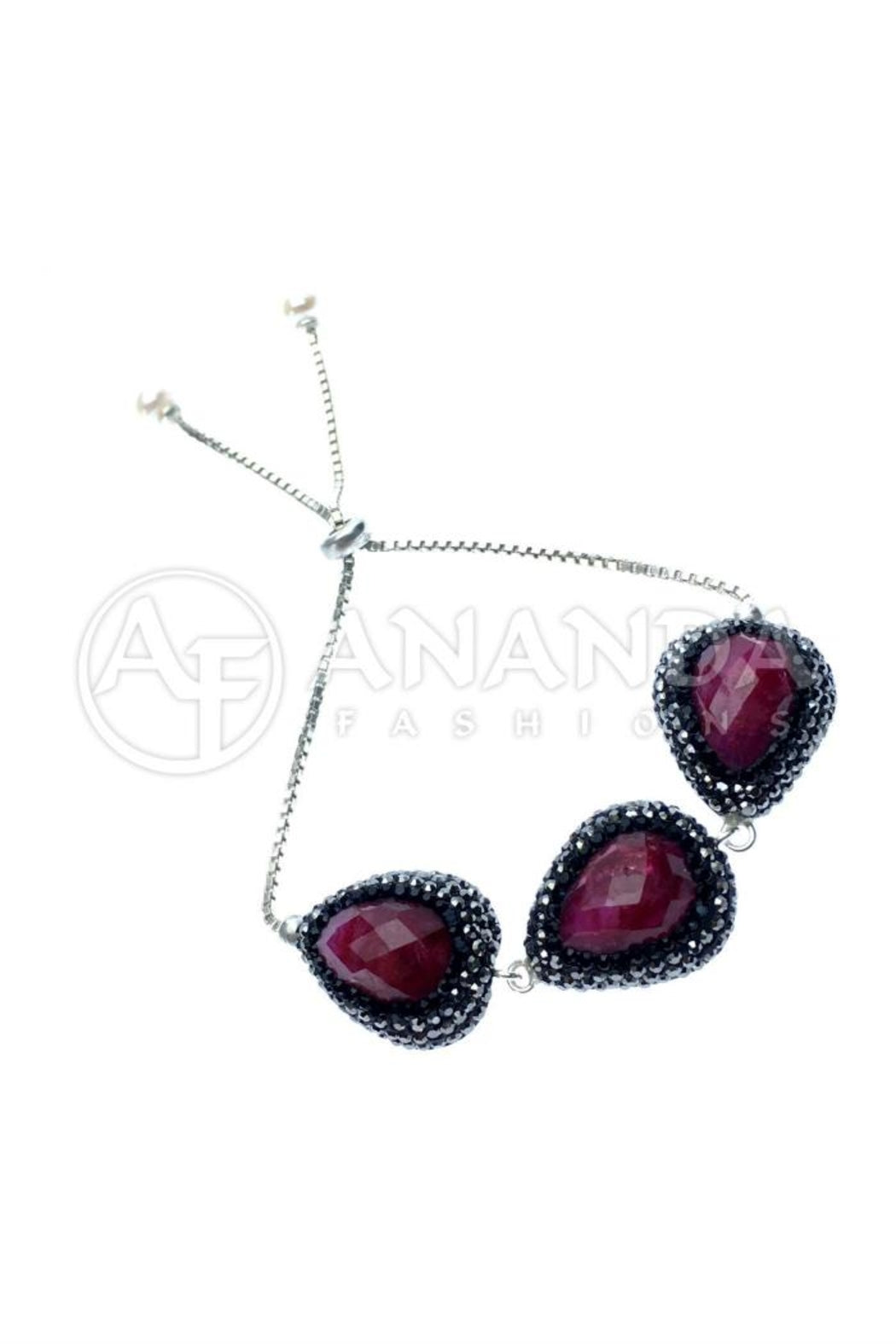 Handcrafted 925 Silver Adjustable Bracelet with Ruby, Swarovski Crystals and a Rhodium Overlay. NOTE:This item is handcrafted and made to order and ships within 3 to 4 weeks. Not available for immediate delivery.