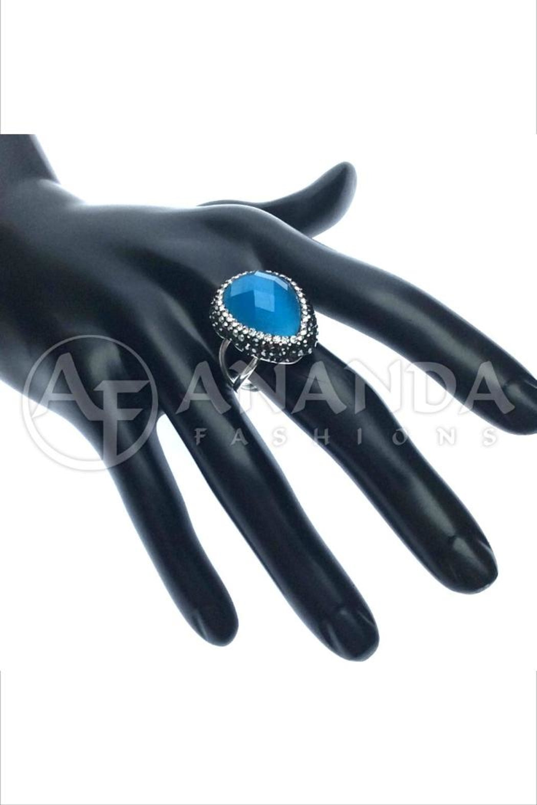 Handcrafted 925 Silver Ring with Blue Cats Eye, Hematite and Swarovski Crystals. Size adjustable. Rhodium overlay.