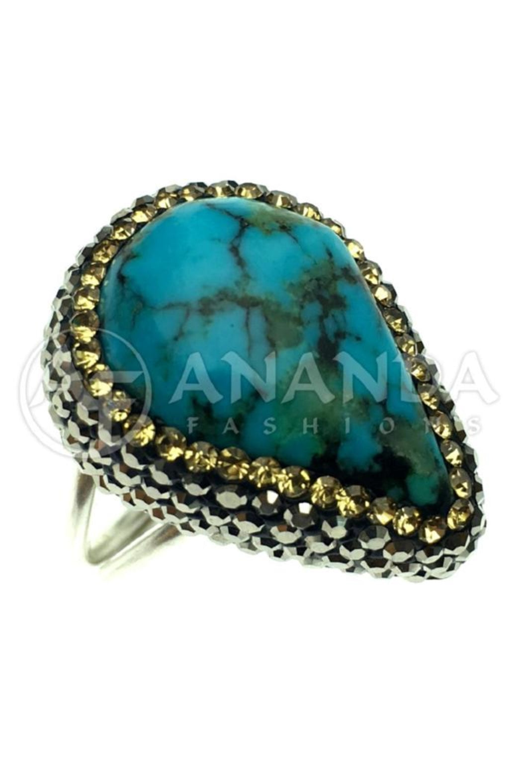 Handcrafted 925 Silver Ring with Turquoise, Hematite and Swarovski Crystals. Size adjustable. Gold overlay.