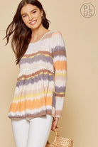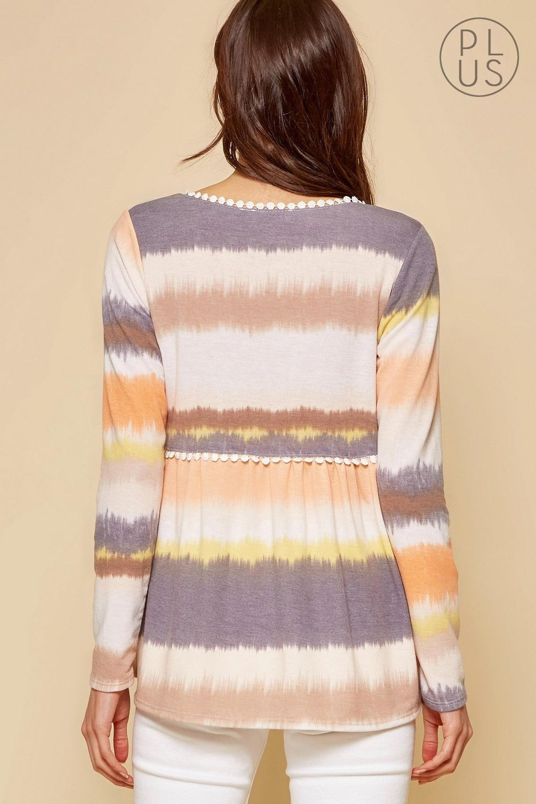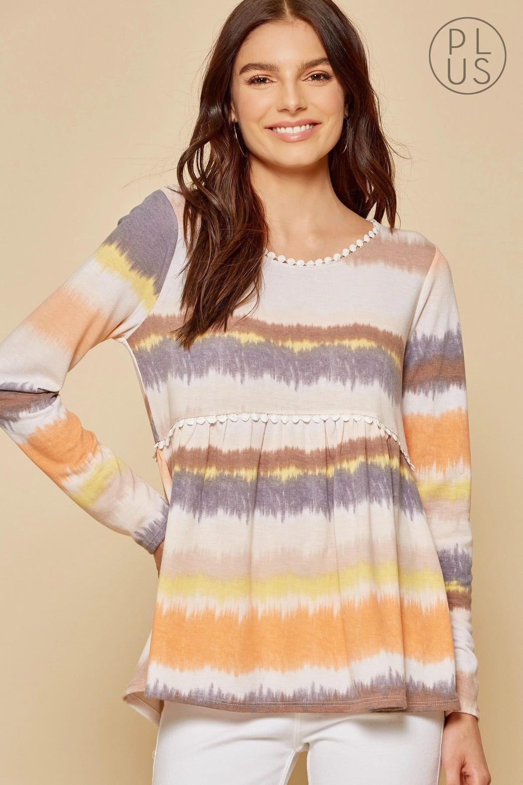 This gorgeous Tie-Dye Baby doll top is perfect for any season. The fabric is lightweight so it's still perfect for cooler summer days. The orange, white, yellow, and brown in it can be paired perfectly with any type of bottoms. This top also has a pom pom lace detail around the waist and at the neckline to give it a little extra detail.