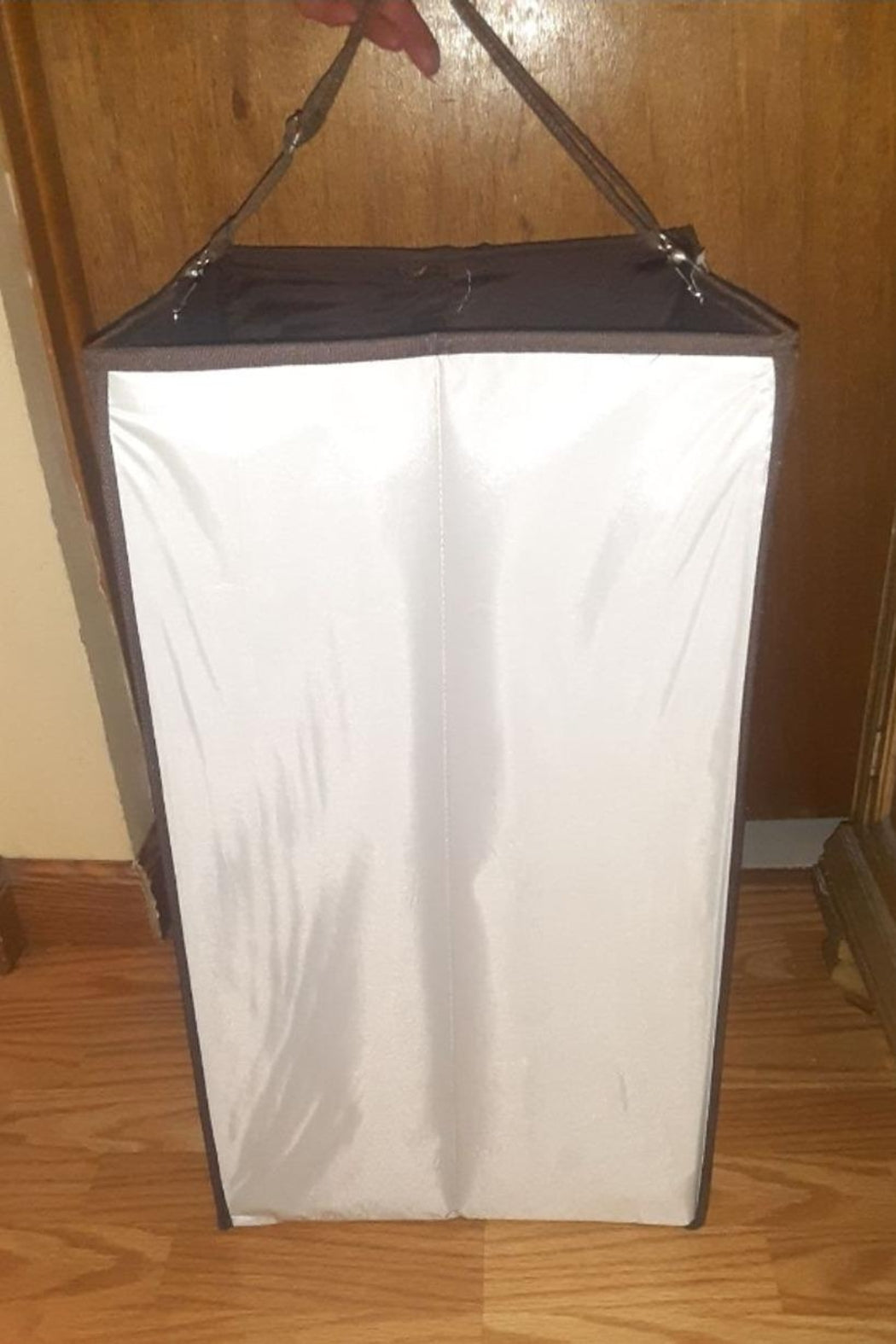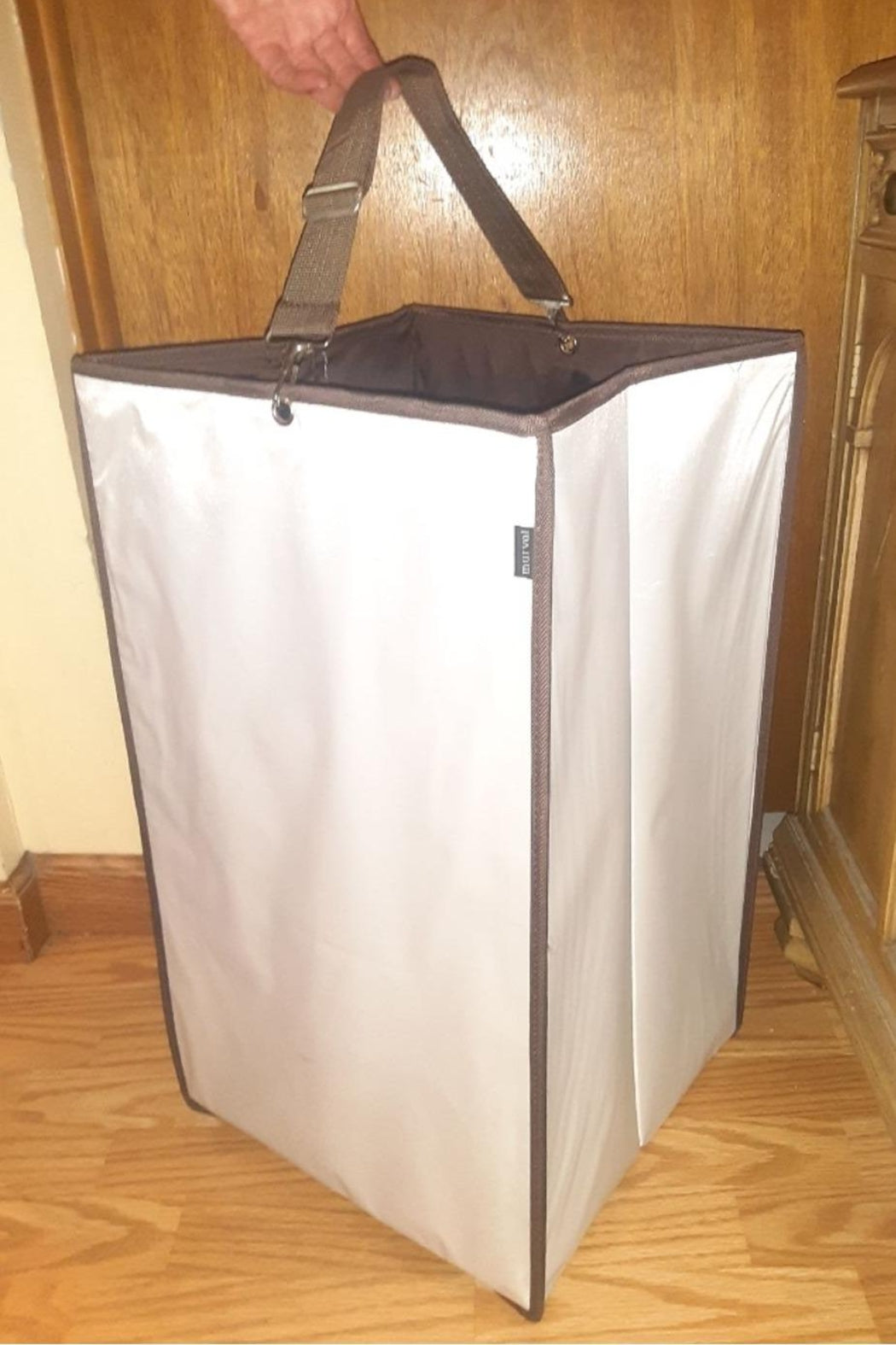 13" x 13 "x 23". Standing at 23 inches tall, this collapsible laundry hamper is built with reinforced polyester siding and a base square insert for improved structural strength. Decorated in a timeless white and brown, this laundry basket features a detachable shoulder strap which is adjustable for easy transport. Easy to maintain and built to last. Perfect for any size family. Enjoy!