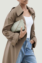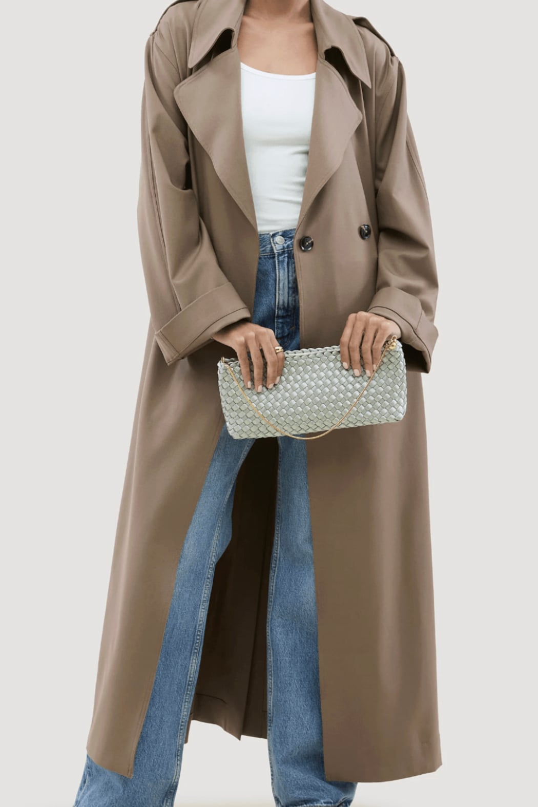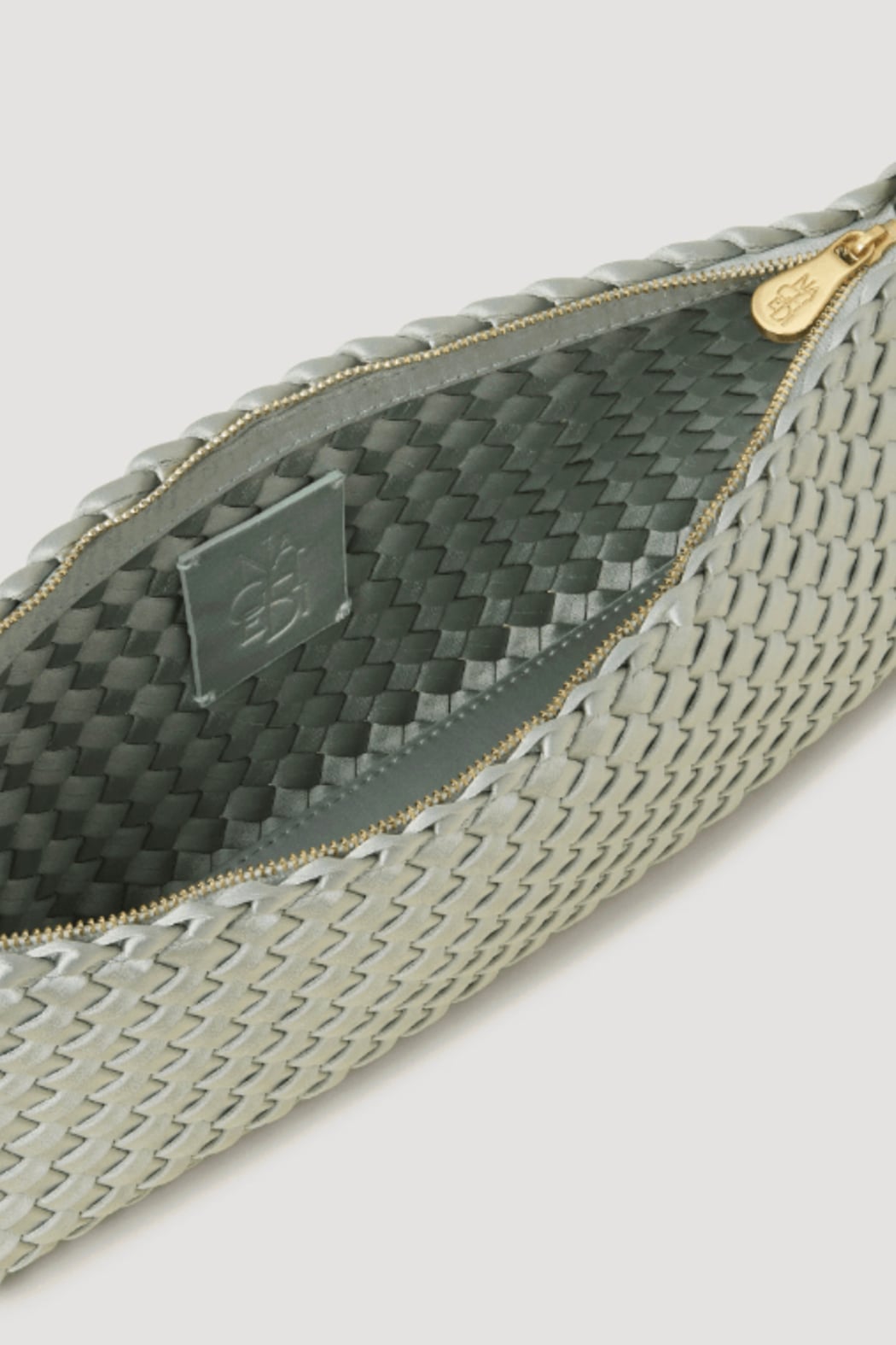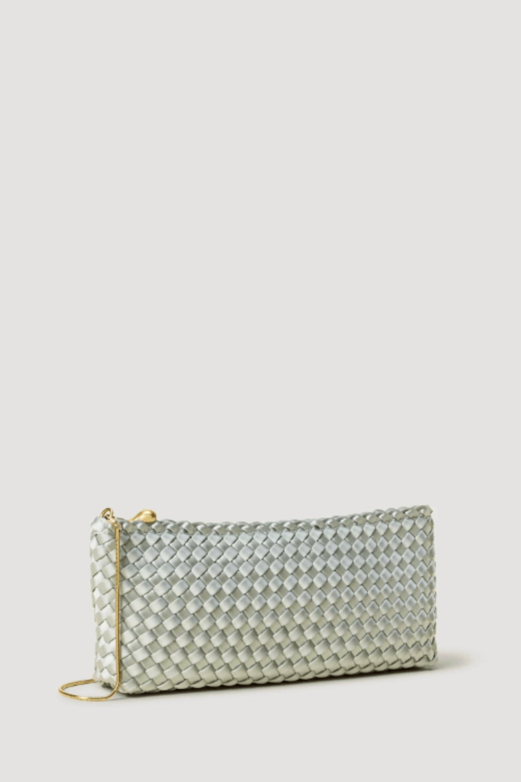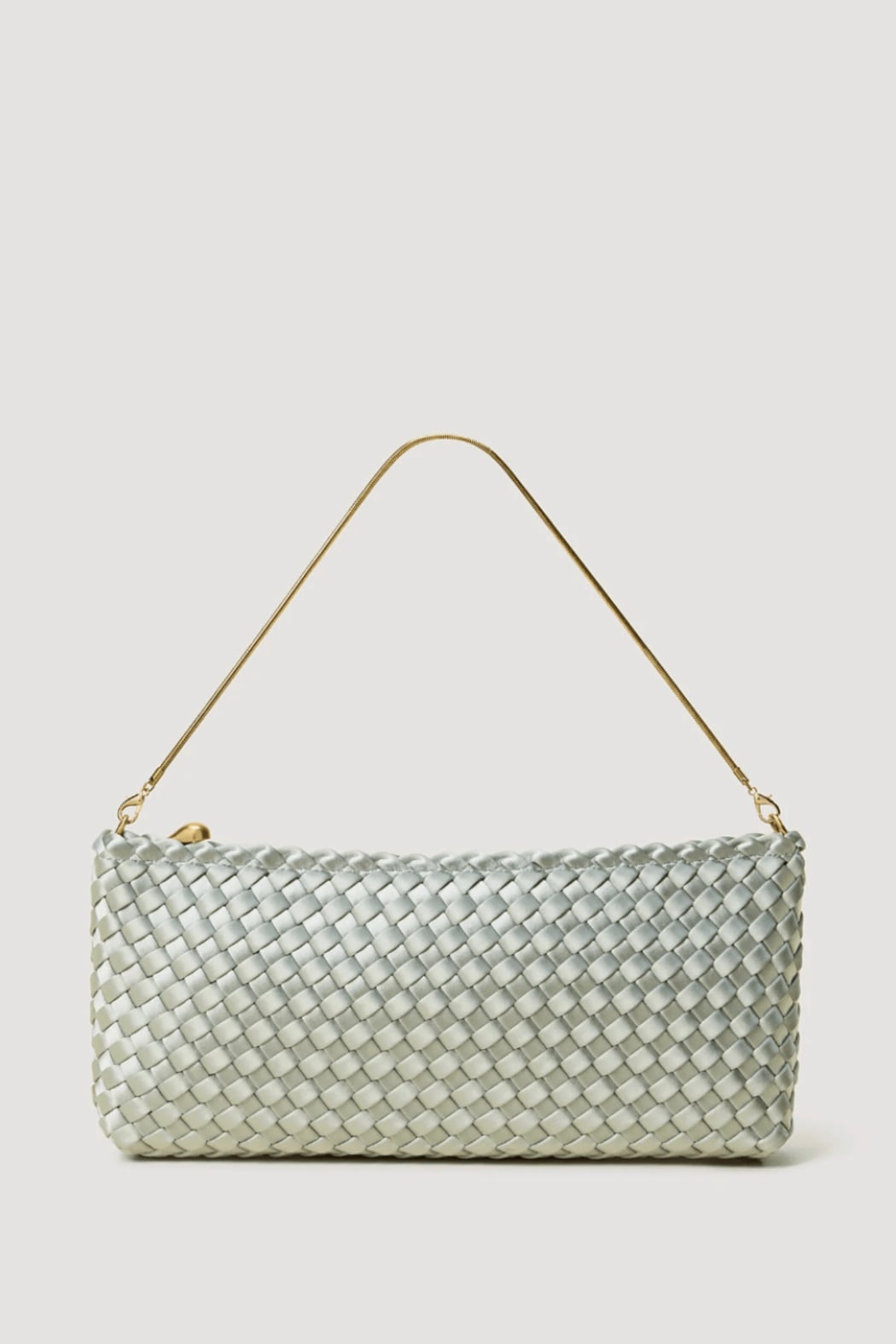 The Gala Clutch in handwoven aqua green satin offers a refined update to the classic evening bag. New for Holiday ’25, this elevated clutch features a sleek baguette silhouette that feels both modern and timeless—perfect as a cocktail party clutch, wedding bag, or holiday evening accessory.