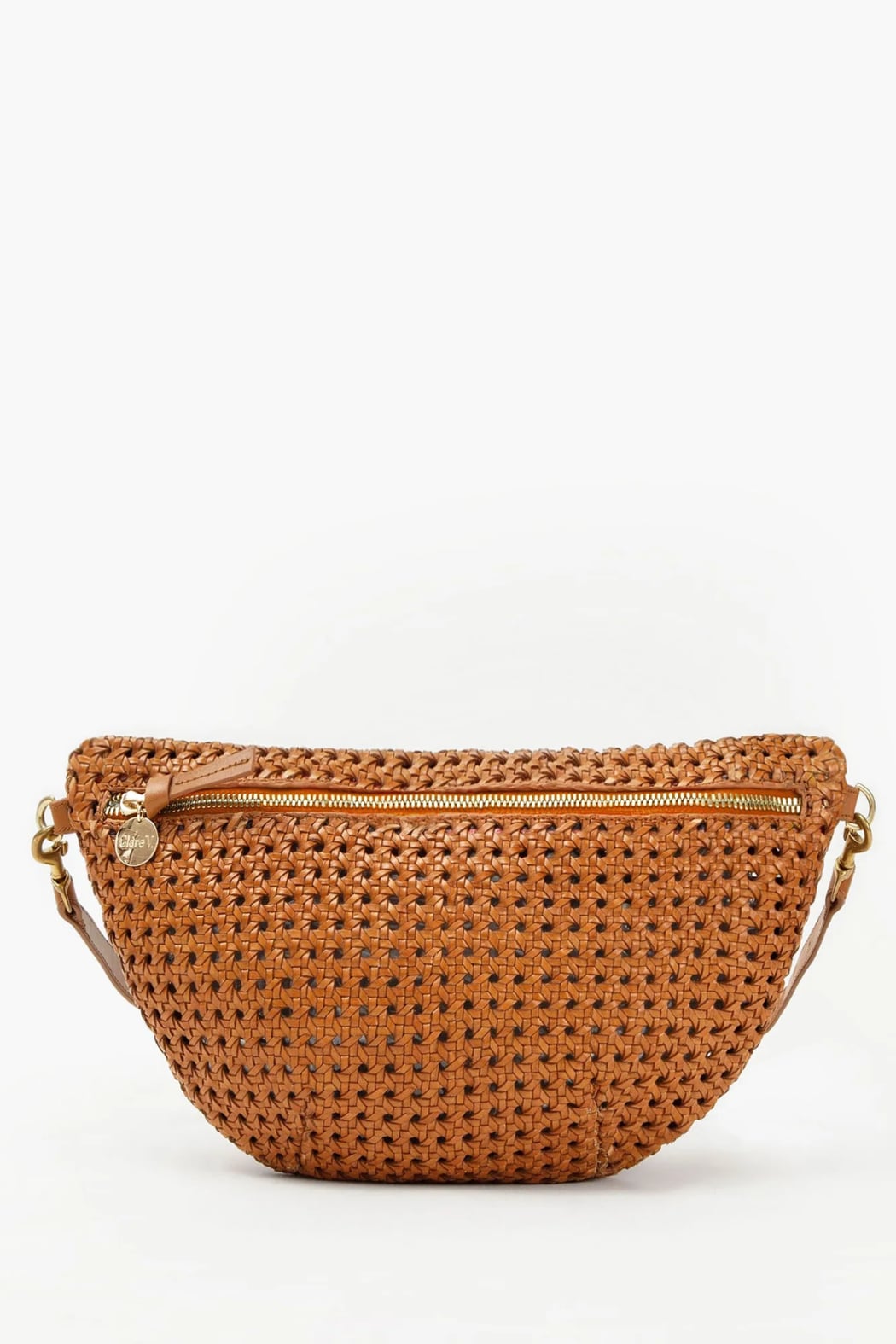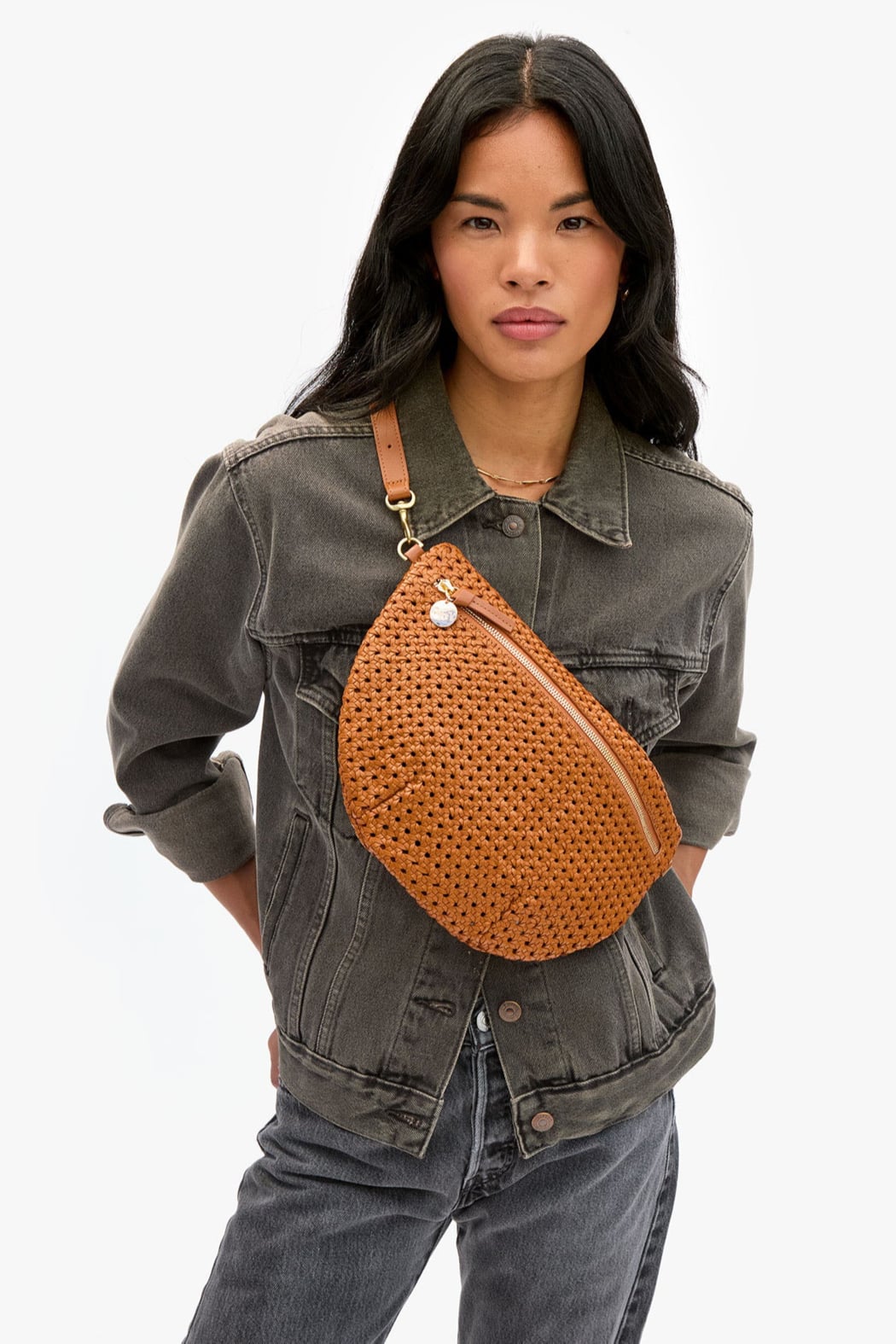 She goes everywhere and with everything. Your new go-to, hands-free, Cross body or bum bag or shoulder bag with a detachable / adjustable / interchangeable strap. Made of unlined, handwoven leather in a rattan pattern.