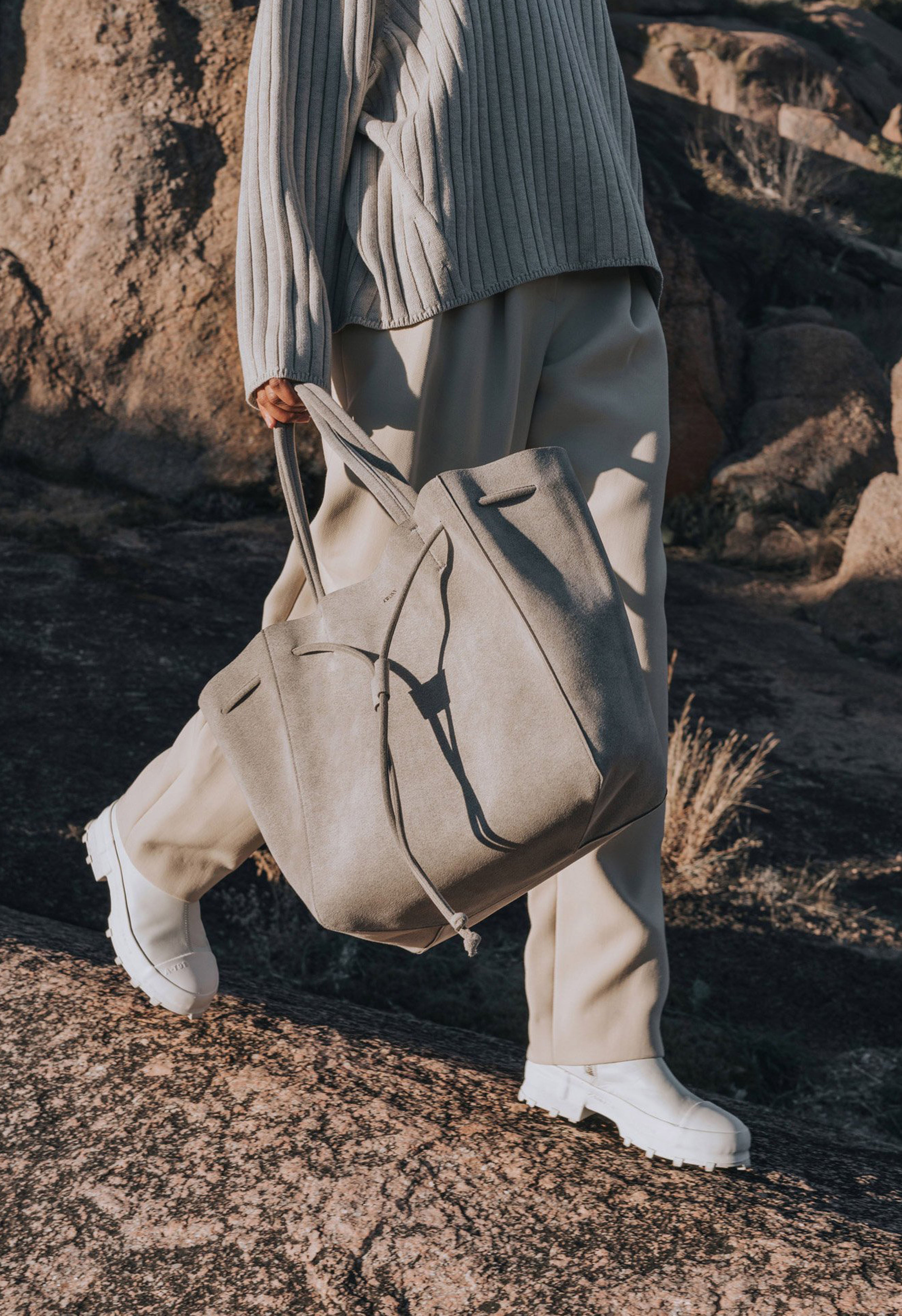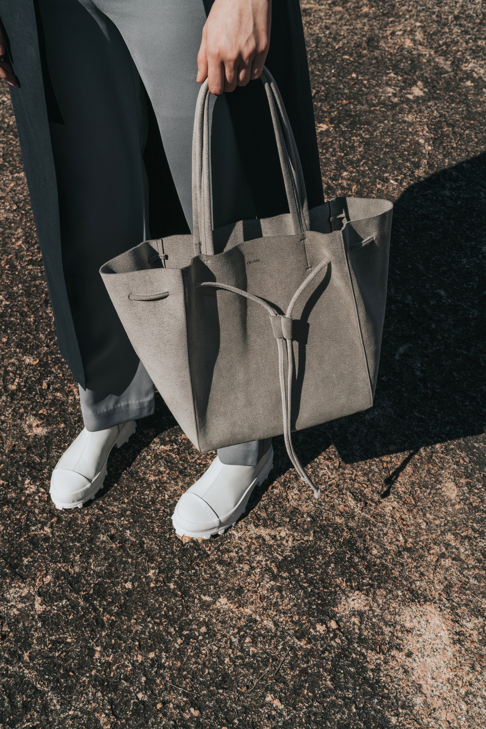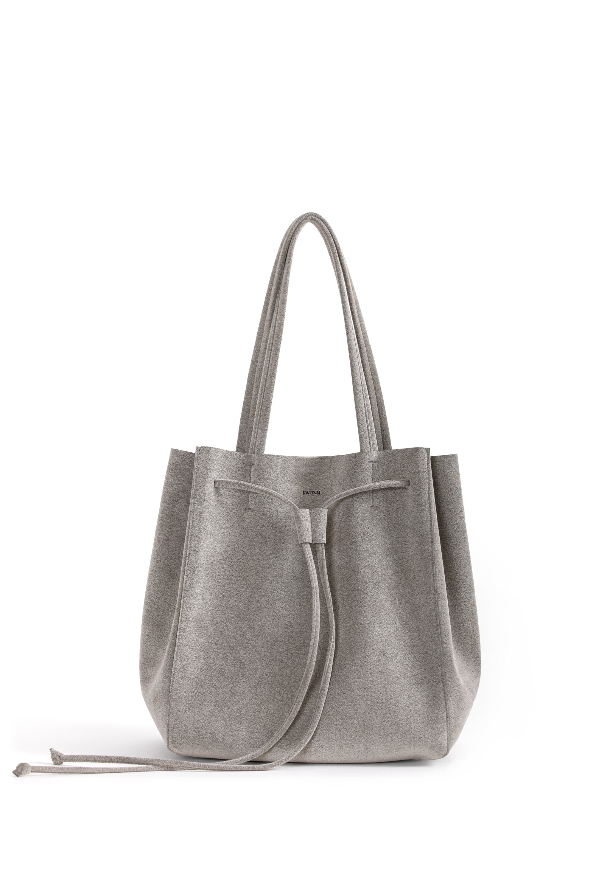 KWONN Shopper is made with vegan and sustainable performance fabric that's durable and easy to clean. The Shopper can be worn as a large shoulder bag or as a smaller size bucket bag by pulling the drawstring at the center of the bag. The exterior of the bag has a subtle shine coating, and the inner material features a softer texture with an uncanny suede feel.