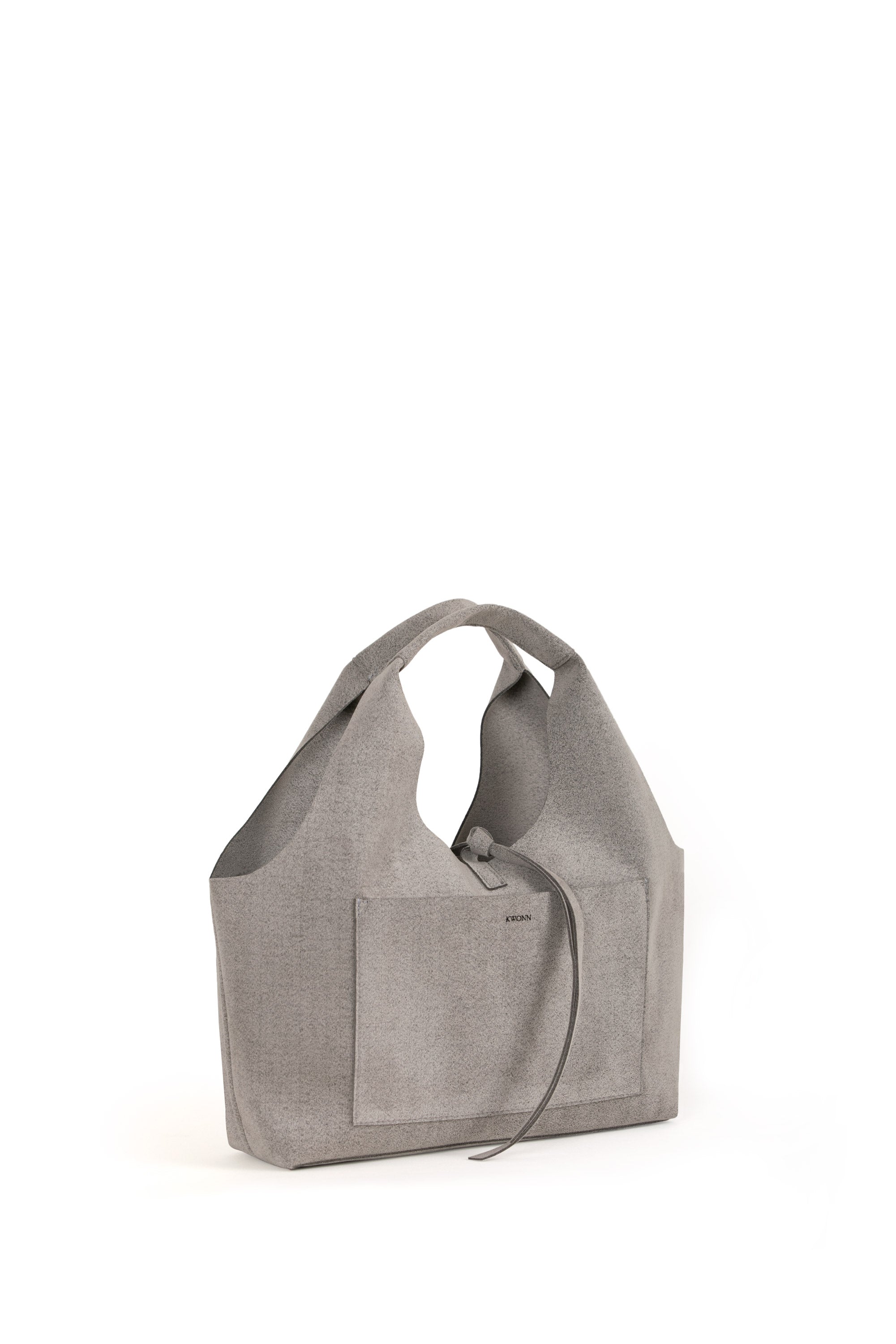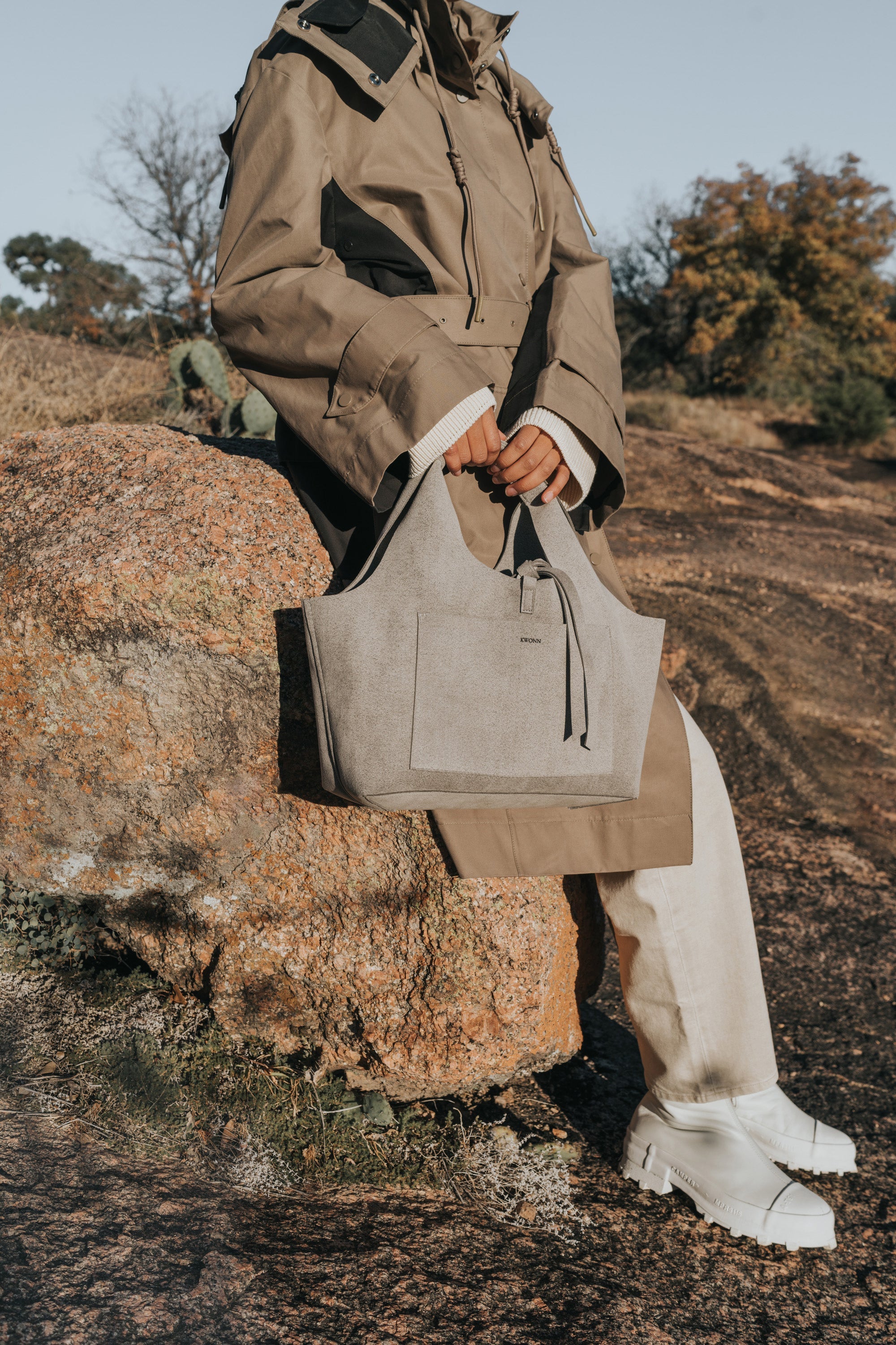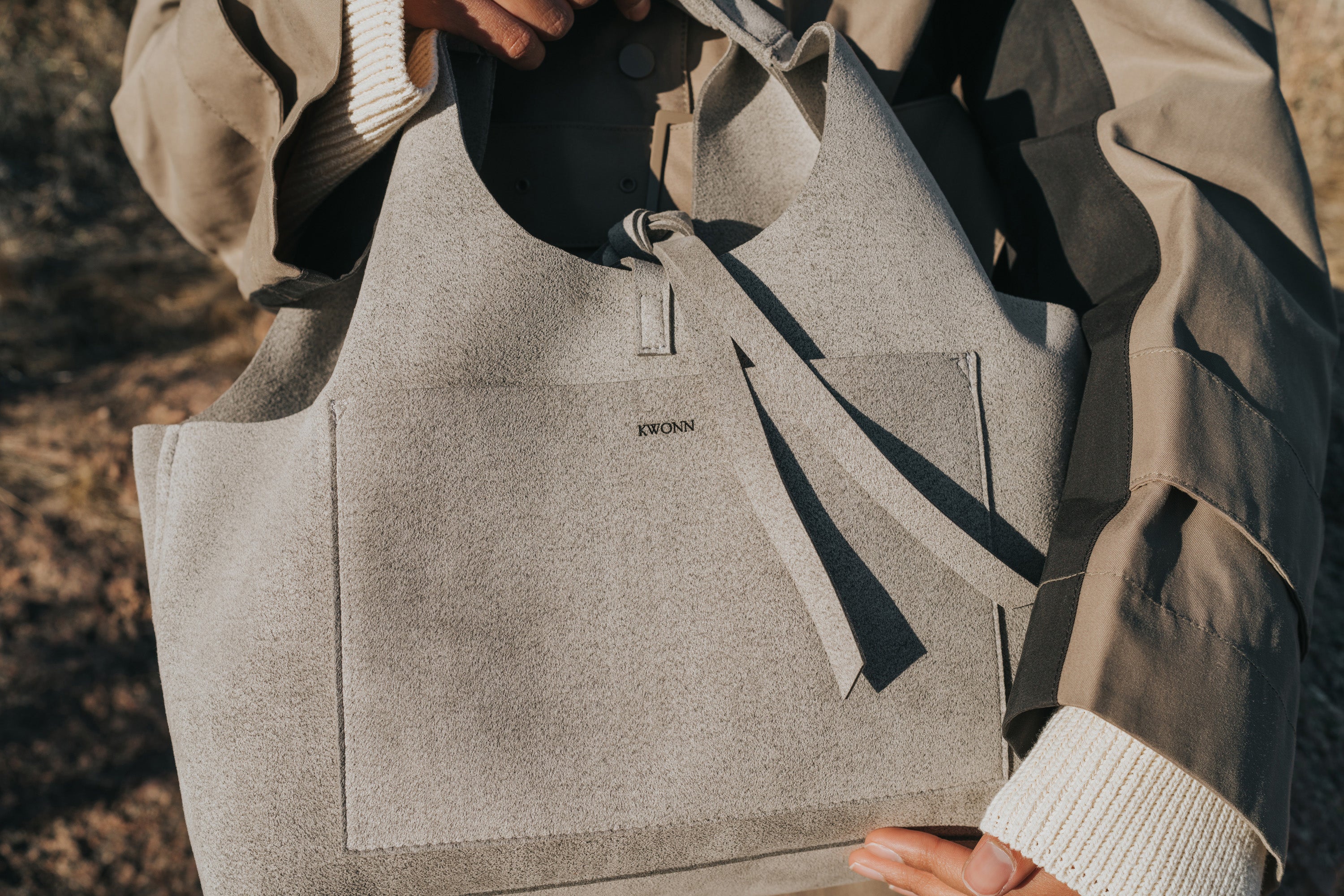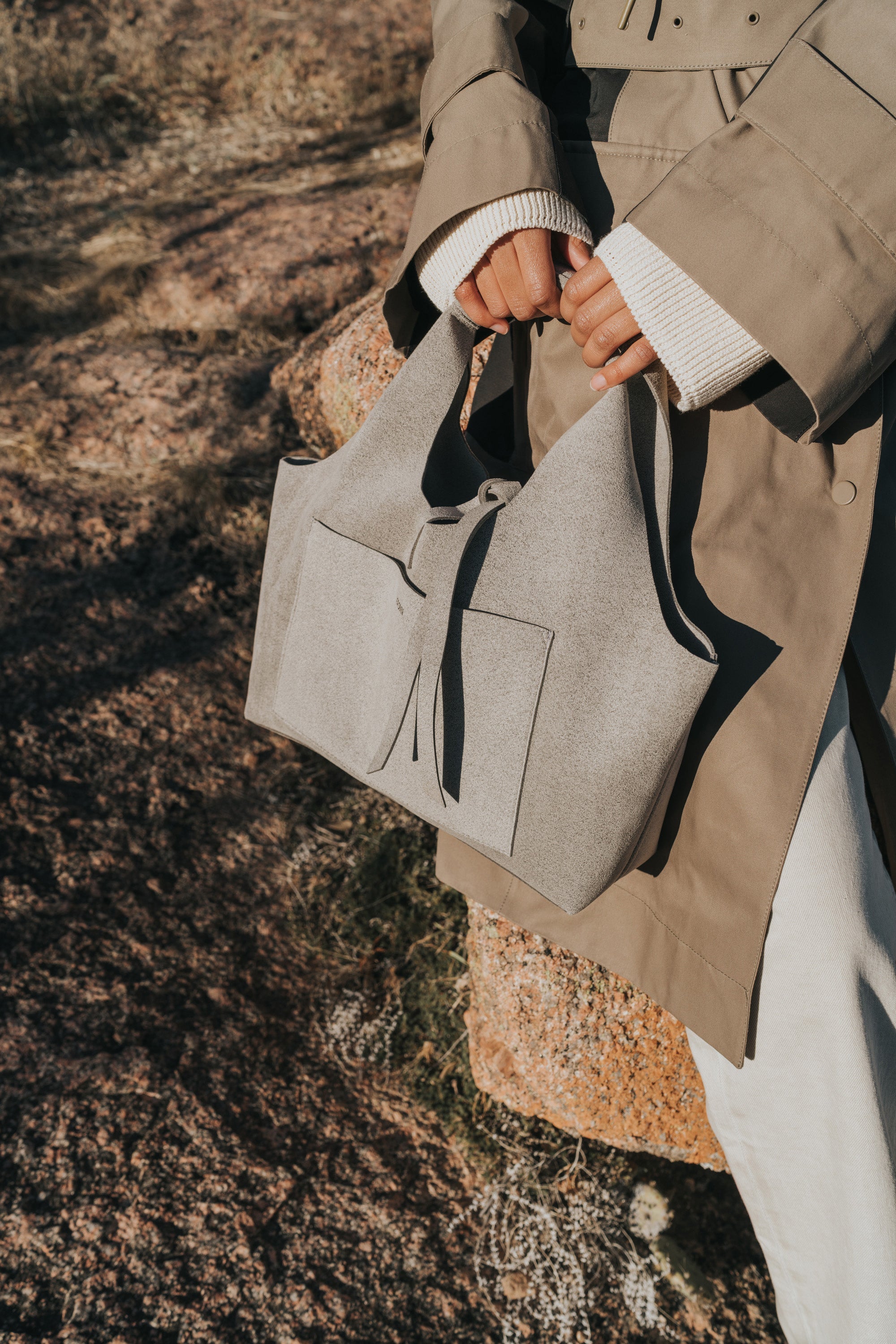 The Tote is made with vegan and sustainable performance fabric that’s durable and easy to clean. The material features a buttery soft texture with an uncanny suede feel and can be closed with self-tie straps.
