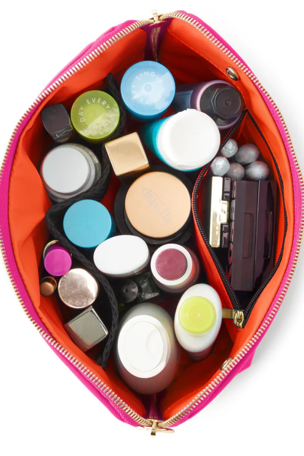 Upgrade to the makeup bag that not only stores and protects your makeup, but has pockets made for your beauty blender, eyelash curler, and more. The Signature Makeup Bag has roomy compartments and opens on three sides to allow for easy access to see all of your products. No more digging! Add a Snap-in an Organizer for more organization and separation. Fabric bags are fully machine washable. Leather bags have a zip-out interior liner that is machine washable.