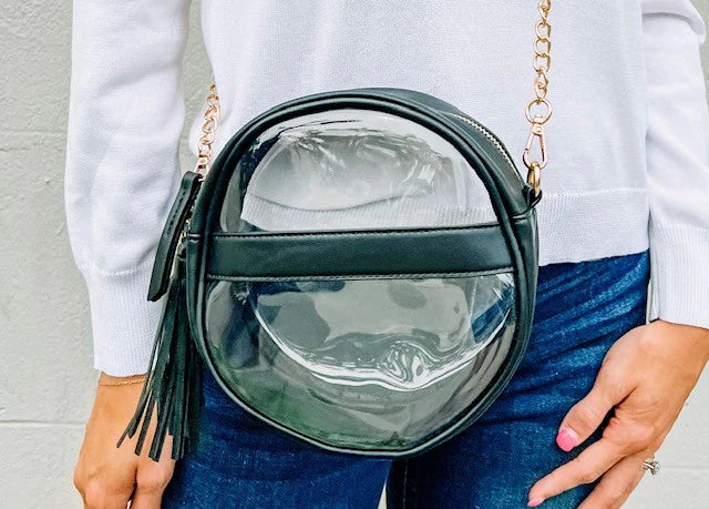 Introducing the Madison Clear Crossbody Bag in black! Its unique circular design is both trendy and functional. The removable crossbody strap ensures versatility, while the matching material on the shoulder adds comfort. Plus, the side tassel adds a fun, playful touch. Upgrade your style with this must-have bag!