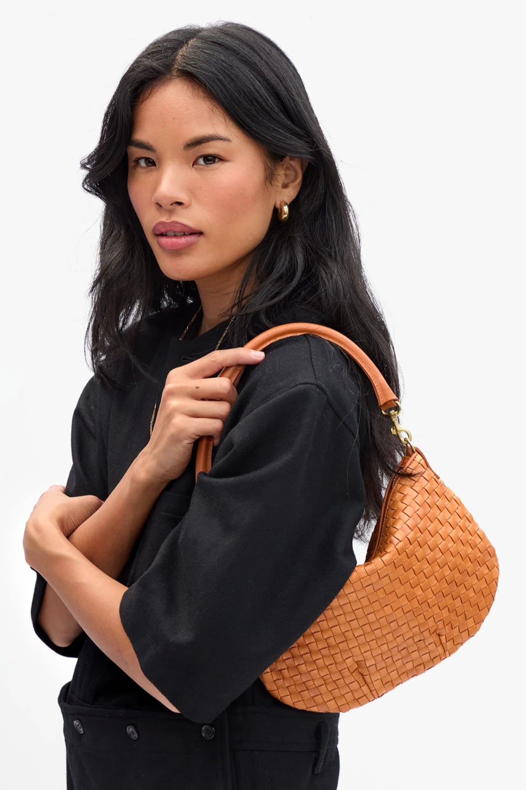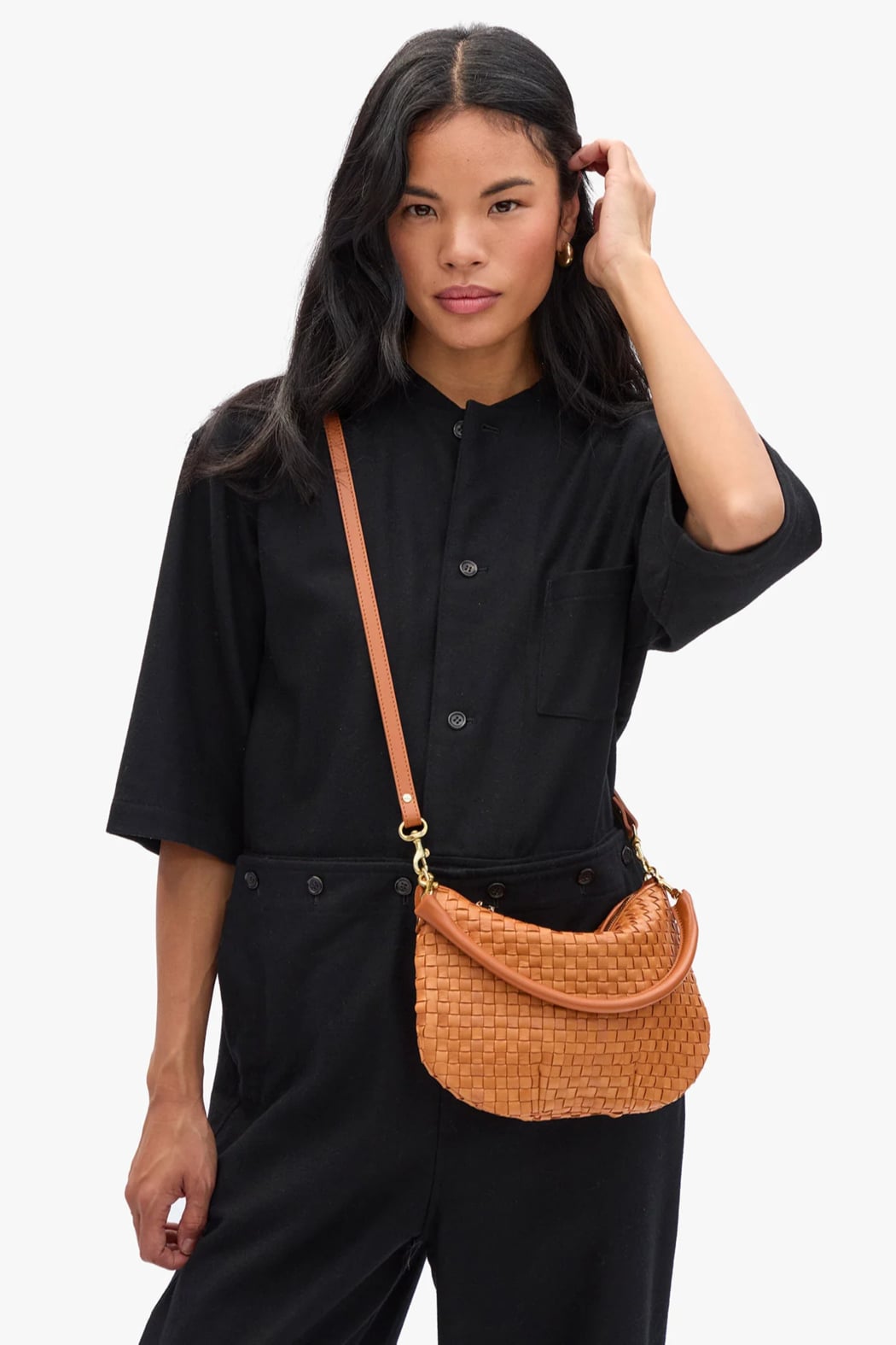 The cutest zip-top mini messenger with tubular shoulder & crossbody straps that holds your phone, keys, small wallet, sunnies . Made of handwoven leather