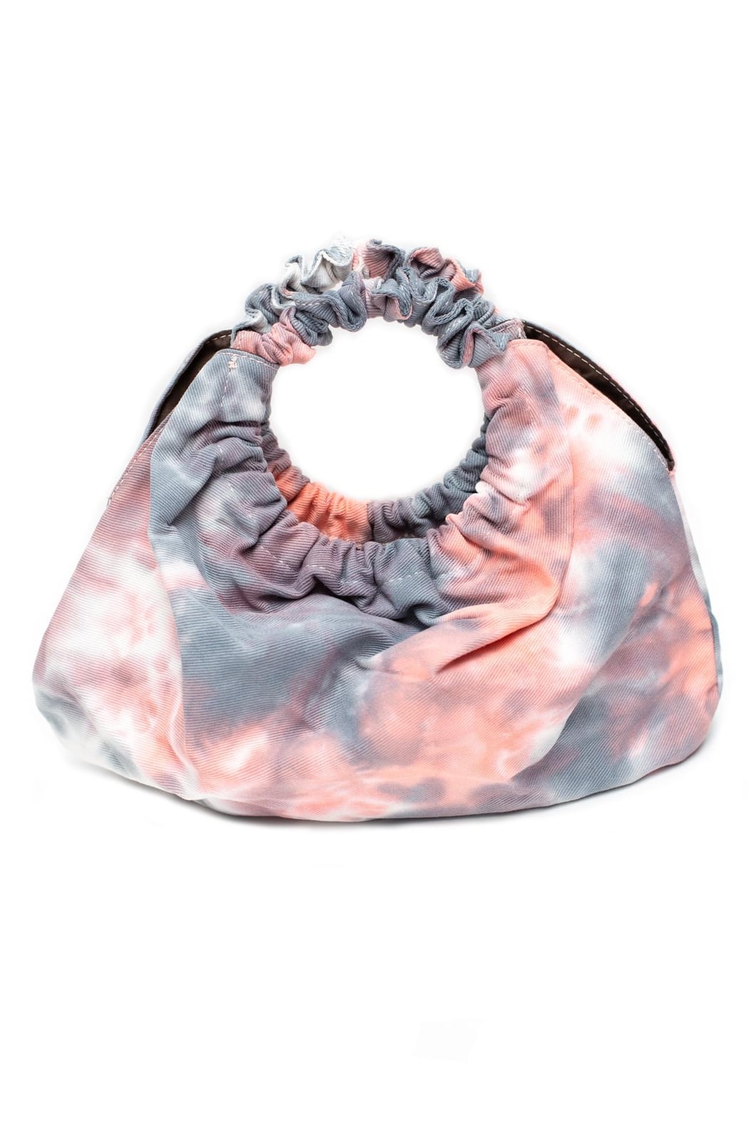 Tie dye print handbag with canvas texture, circular handle, and magnetic snap closure. Approximate size: 14" x 12in.