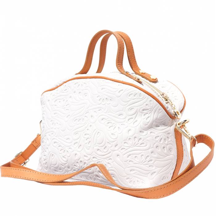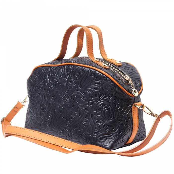 Long and removable strap, an interior small (purse like) pocket and a top zip closure.