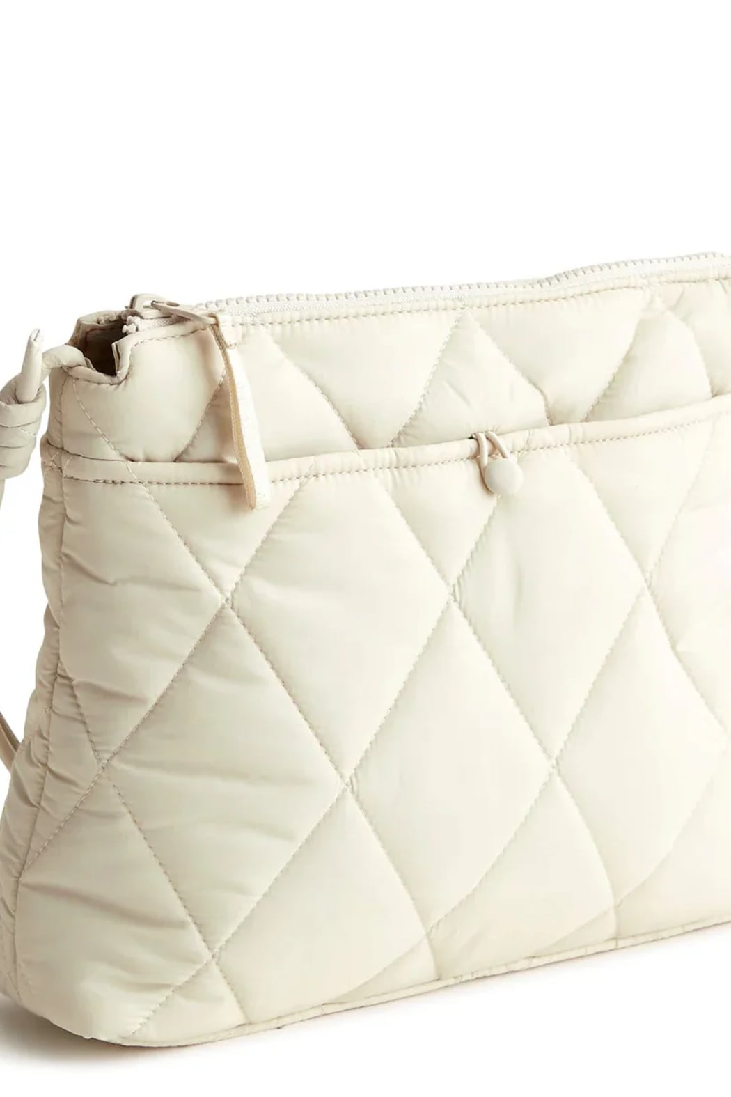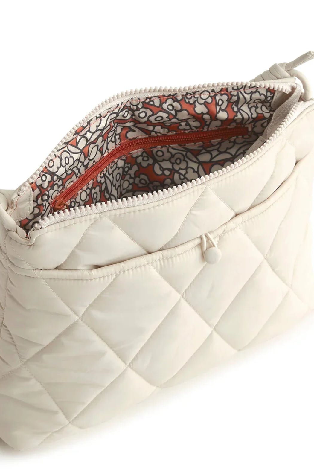 Cute, compact, and effortlessly stylish, this chic nylon hipster keeps all your small essentials within reach in a ultra lightweight quilted nylon fabrication. Designed for the fashion-forward individual who values both style and function, Vera Bradley's Original Hipster Crossbody bag is perfect for any occasion. Whether running errands, heading to the office, or traveling, this versatile crossbody complements your busy lifestyle with its timeless design and convenient features. The exterior features a quilted nylon fabrication, zip top closure, adjustable straps with friendship knots, and a spacious front pocket with a button loop closure and a spacious pocket on the back with a magnetic closure. The spacious interior features a whimsical lining and one zip close pocket. Approximate dimensions 11" x 9" x 2.75". Refer to dimensions for proper size as picture does not allow for full view of bag. The color, Pumice Stone, is more off white than beige.