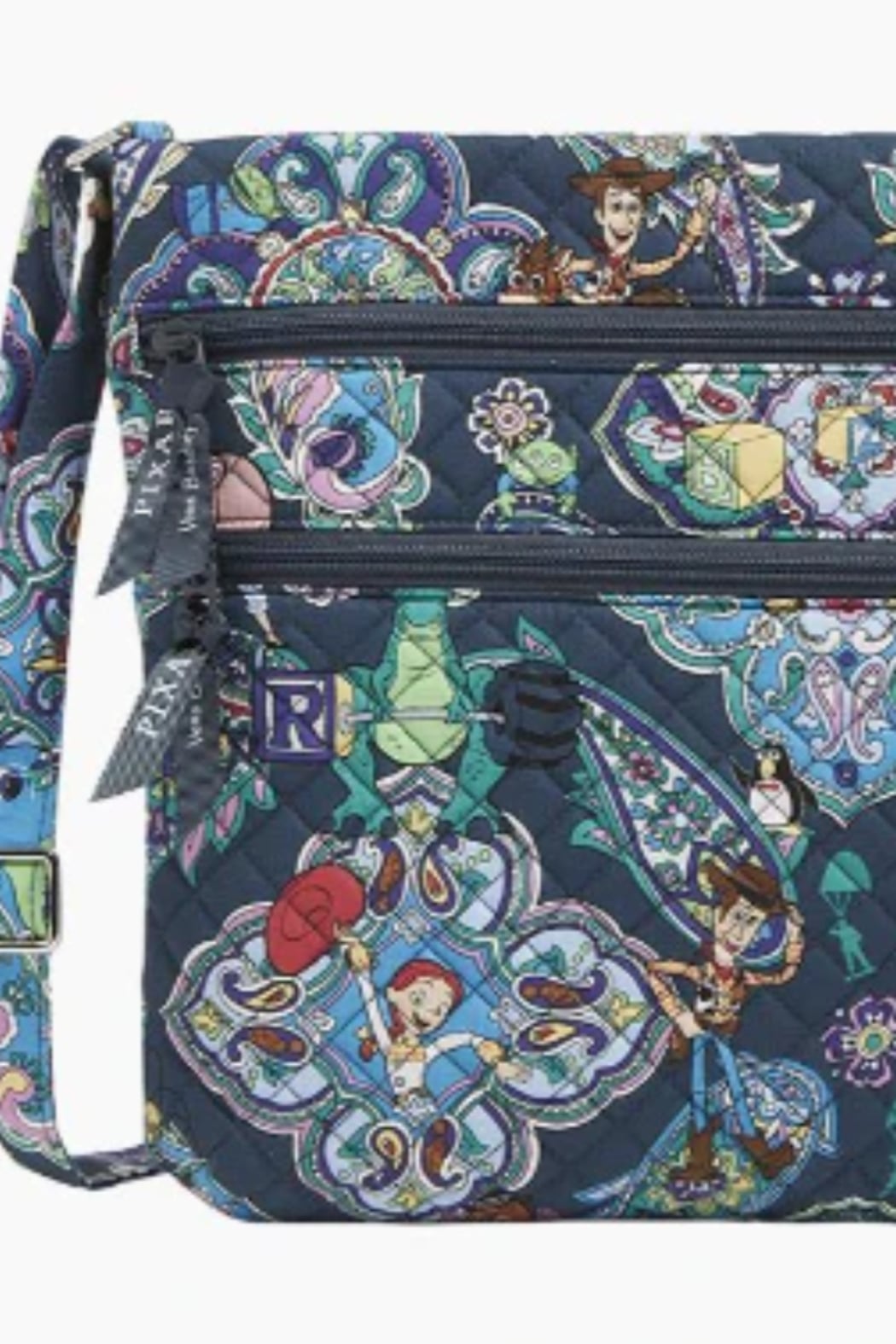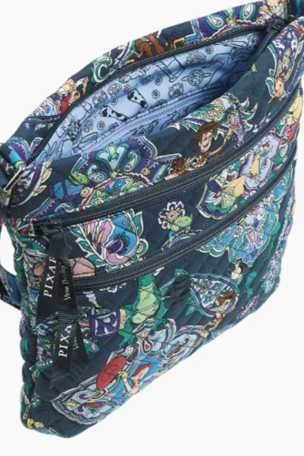 You can take a little Disney fun with you everywhere you go. And every day is a little happier and a little brighter with friends at your side. The ultimate in hands-free organization, this clever crossbody features three separate zippered compartments. Toy Story characters displayed on cotton that is colorful and lightweight. Exterior features one slip pocket and two zip pockets.