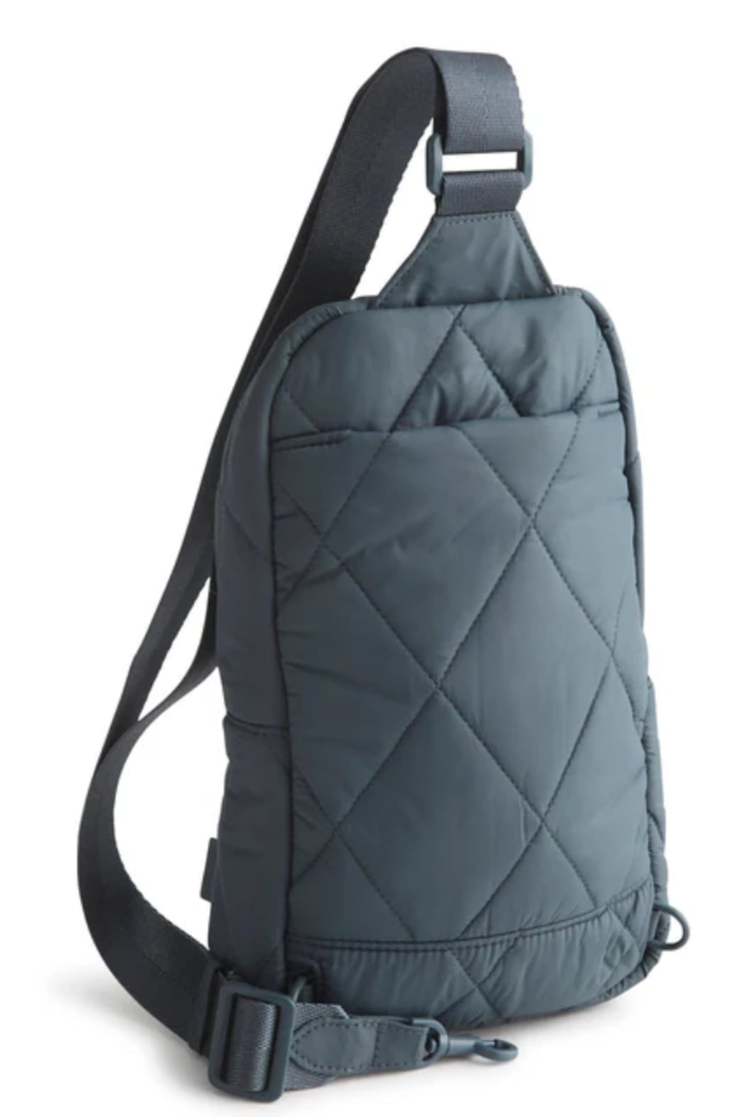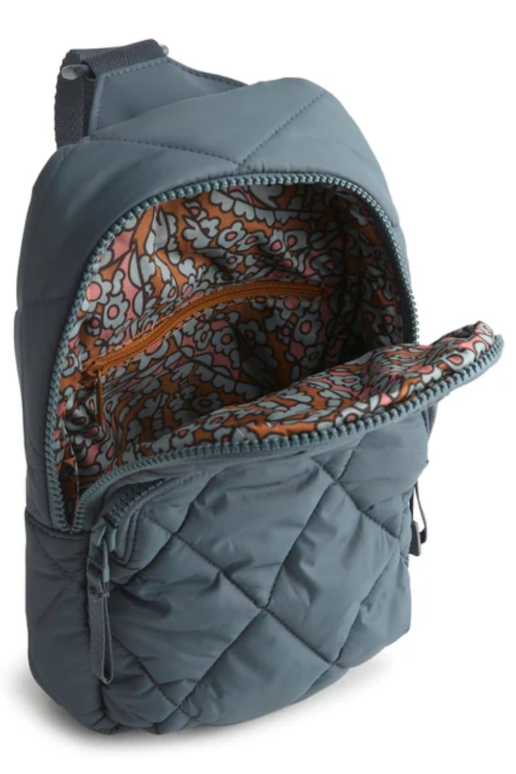 The Lorman Sling Backpack by Vera Bradley is the ultimate combination of style, comfort and functionality for your on-the-go lifestyle. Designed to keep your essentials close at hand while keeping you comfortable during your adventures, this sleek and versatile backpack is perfect for urban commutes, outdoor excursions, travel and everyday use. Small but mighty, this sling backpack has the functionality you expect from Vera Bradley products. The adjustable strap adjusts to 44" at it's longest length. The exterior features a quilted nylon fabrication, a slip pocket and a zip compartment. The main compartment features a whimsical floral pattern and a zip compartment. Approximate dimensions are 6.5" w x 11.0" h x 2.75" d