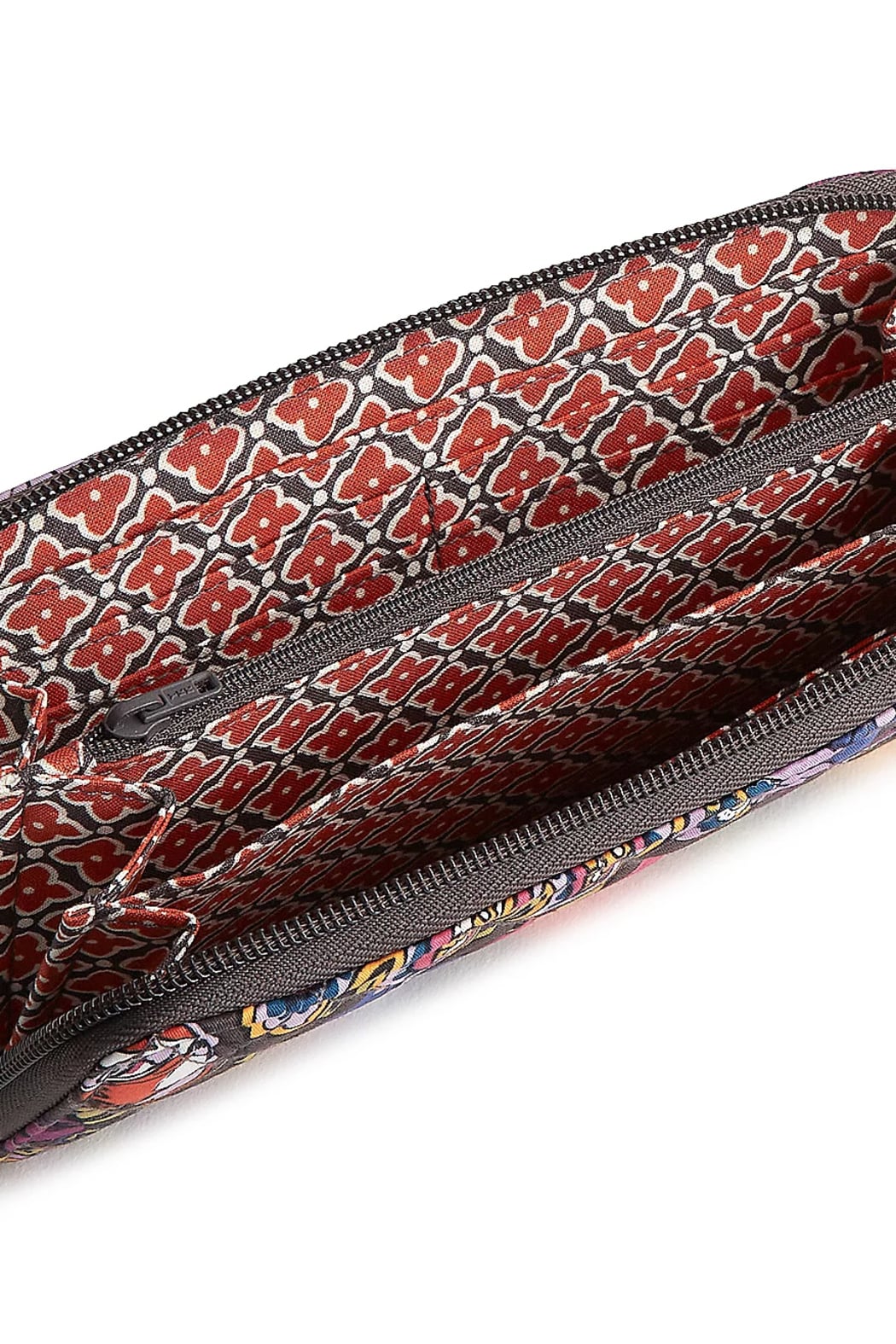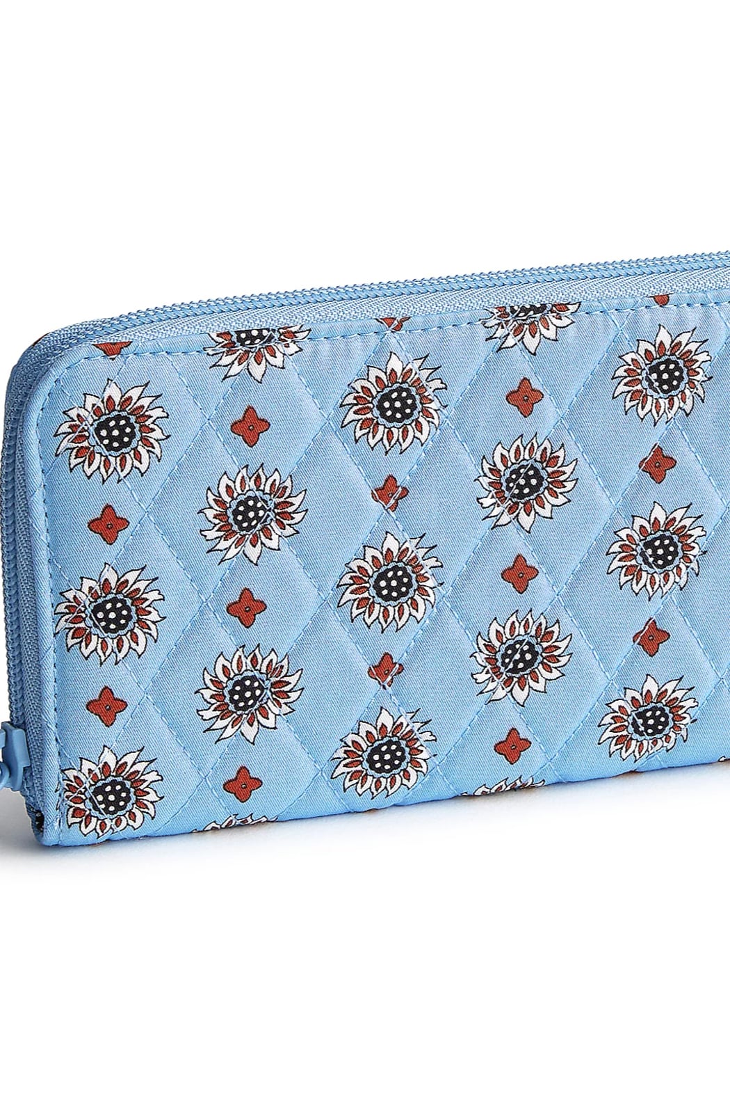 Whether you're running errands, heading to the office, or enjoying a night out, this versatile wallet has got you covered and featured in a great classic pattern. A little fun and spirited. Features include a zip around closure, quilted cotton fabric exterior with a spacious interior containing a coordinating fabric lining and four interior slip pockets for bills, 12 interior credit card pockets, one interior middle pocket with a zipper closure for coins or other small items. See dimensions as wallet is larger that picture reflects.