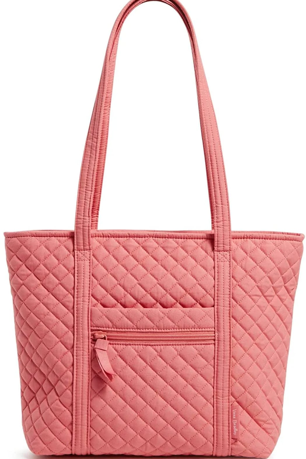 Vera Bradley tote bags are perfect for any occasion - whether you are heading to work, on a weekend getaway, going to a party, or traveling, they are your perfect daily companion. The Small Vera Tote measures 11 inches high, 12 inches wide, & 4 inches deep. With printed polyester lining & 6 slip interior pockets. Featuring a front slip pocket, zip pocket, & a hidden top pocket - ideal for storing your wallet, phone, reading material or snacks. A reliable zip closure secures the main compartment, keeping contents safe and preventing accidental spills. Machine wash cold, gentle cycle.