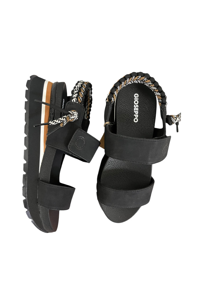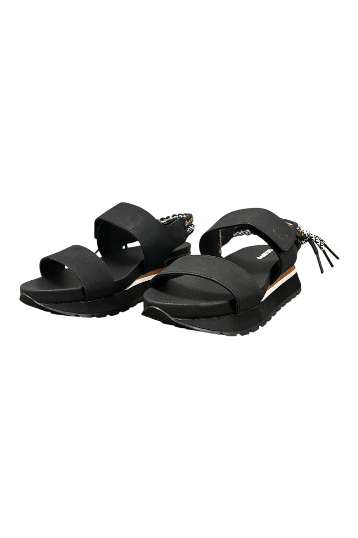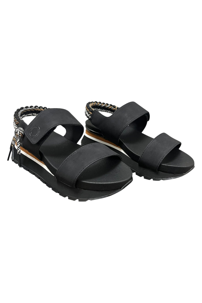Without a doubt, one of the models you can't miss this season. Black sports sandals with an Eva sole. They have a slight wedge that combines various tones. Multicolored lace braiding detail. Adjustable closure. Very comfortable anatomical insole.