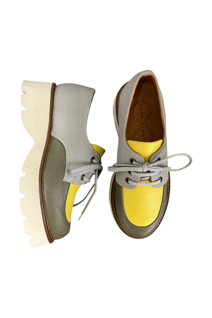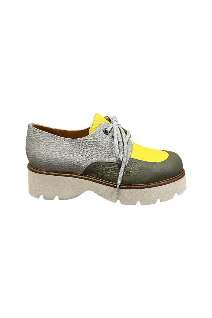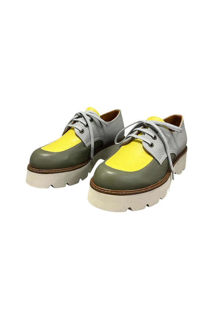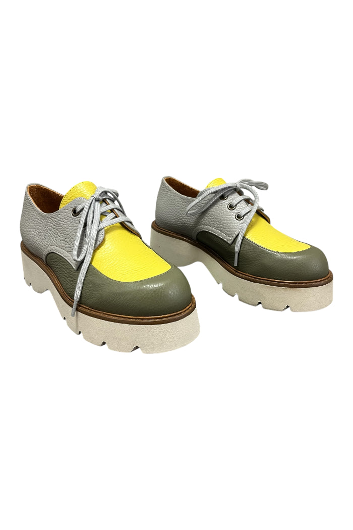 Very soft plain leather Dark Green, yellow and grey colors Real heel height 1.5cm. 4.5cm for heel - 3cm for platform Very soft leather lining Lace-up fastening Rubber sole