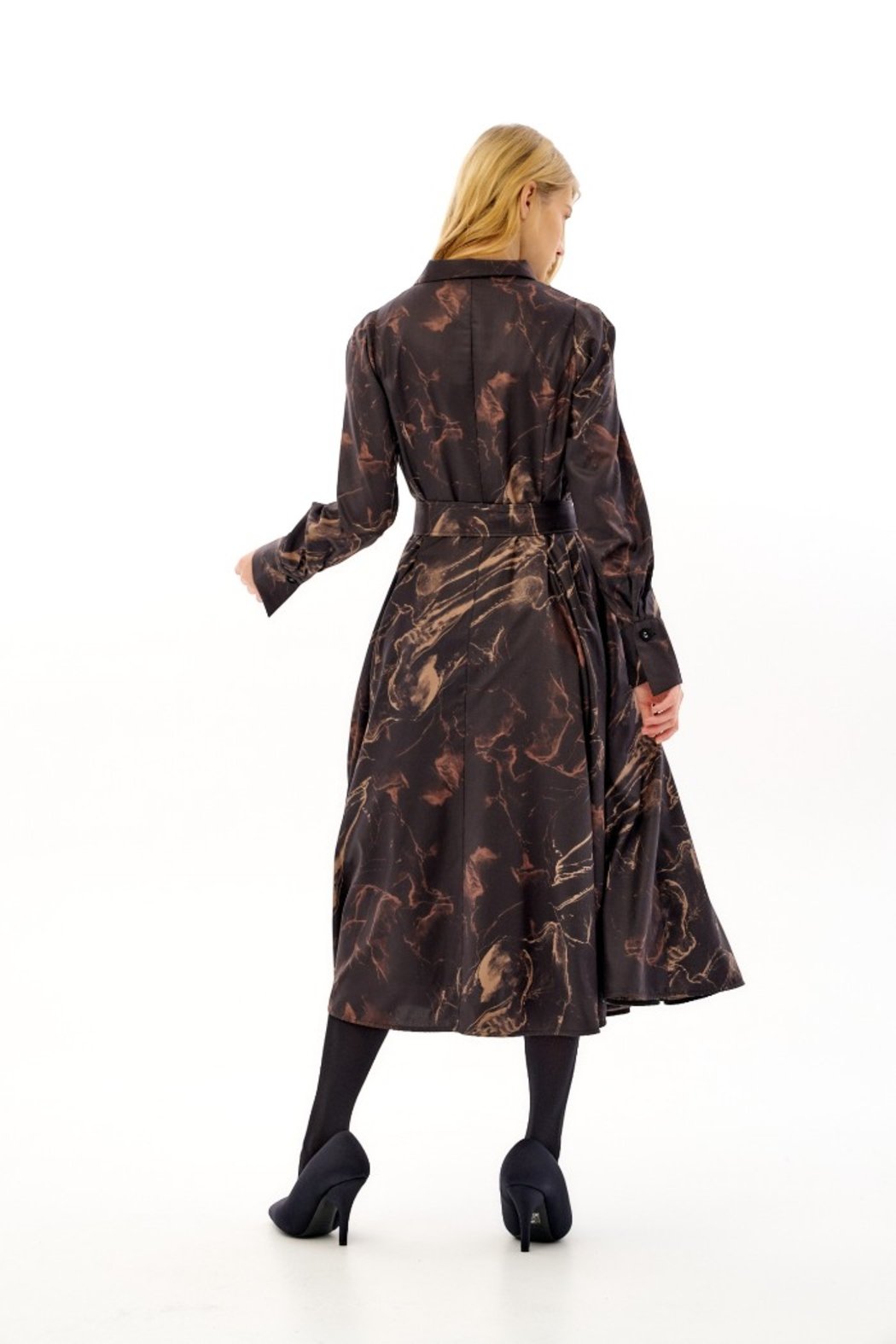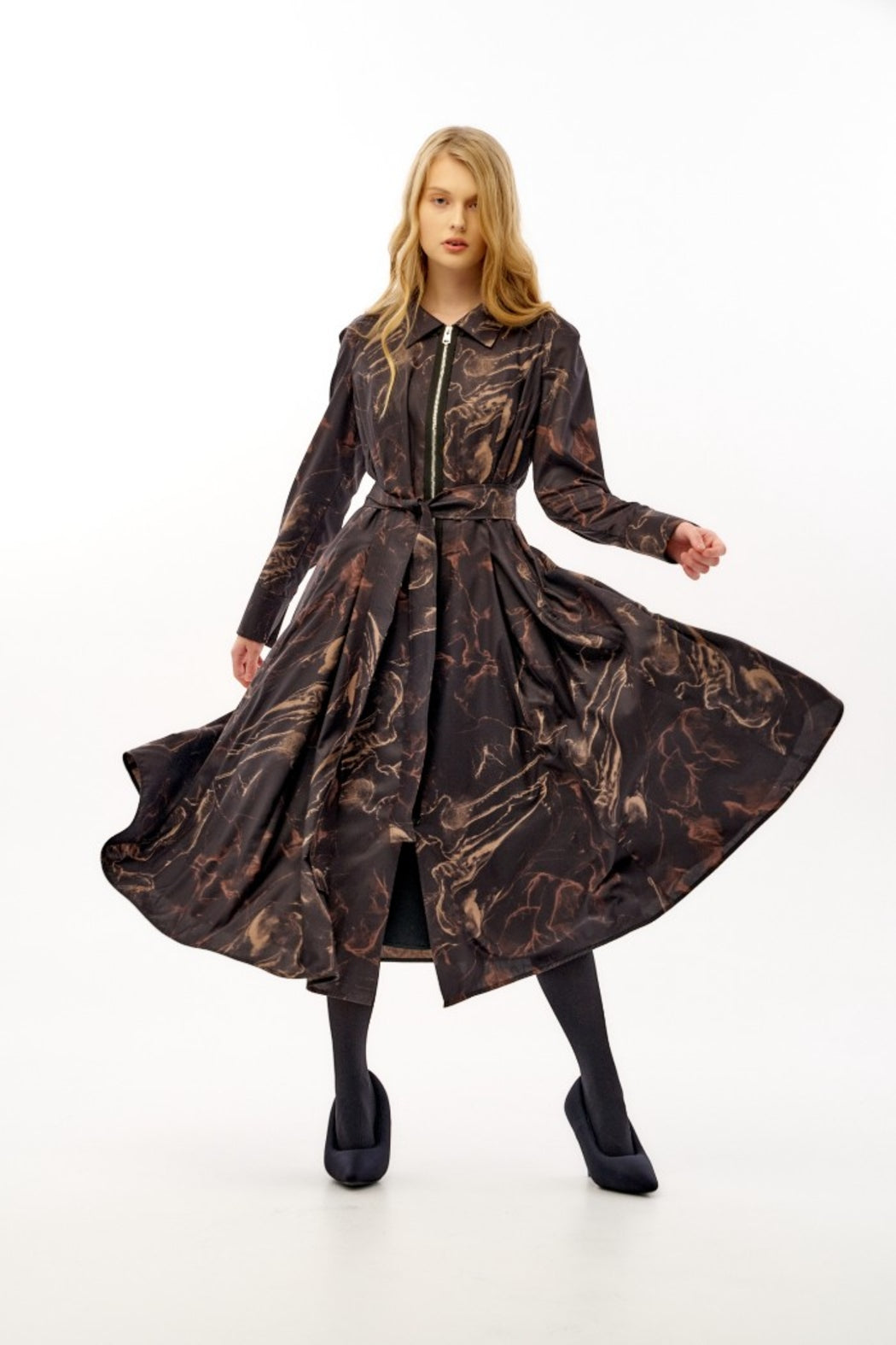 Elevate your wardrobe with the Emanuella Dress from NY77 Design, a refined dress coat that blends modern artistry with timeless elegance. Its long sleeves, softly belted waist, and graceful A-line shape create a flattering, polished silhouette. The striking dark abstract print—rich in black, brown, and gold tones—adds dimension and a touch of luxury. Finished with a pointed collar and a smooth concealed front closure, this sophisticated piece moves effortlessly from daytime outings to special occasions.