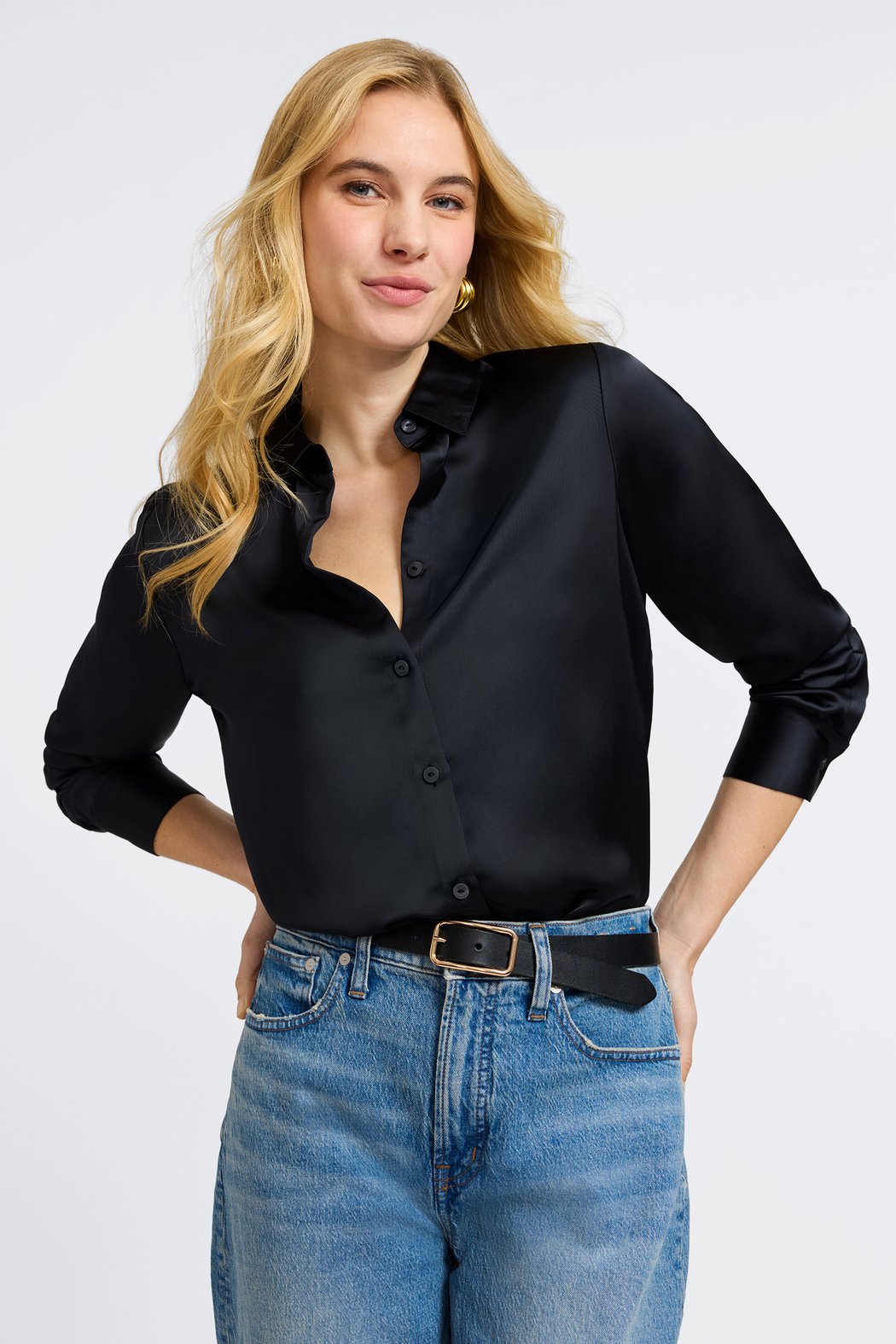 Elevate your wardrobe with the timeless elegance of the Bianca Beyond Silk Shirt. Designed with a classic button-down silhouette, this blouse is crafted from luxe satin-like fabric that drapes beautifully and catches the light with a subtle sheen. The collared neckline, long sleeves with button cuffs, and relaxed fit make it a versatile piece that transitions effortlessly from desk to dinner. Pair the Bianca Satin Shirt with tailored trousers for a polished office look, or style it with denim and heels for modern evening chic. A true wardrobe staple, this shirt brings understated luxury to every outfit.