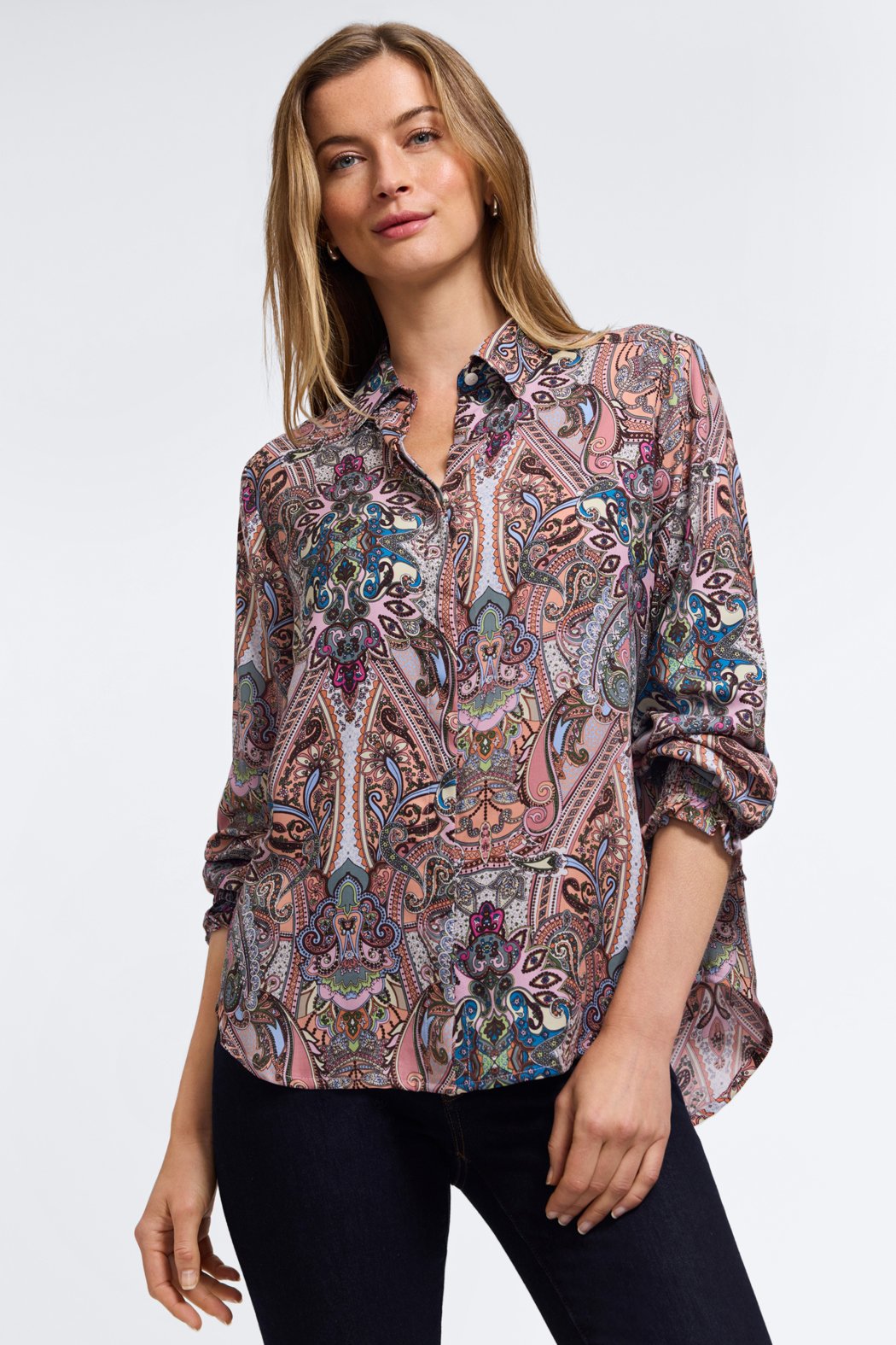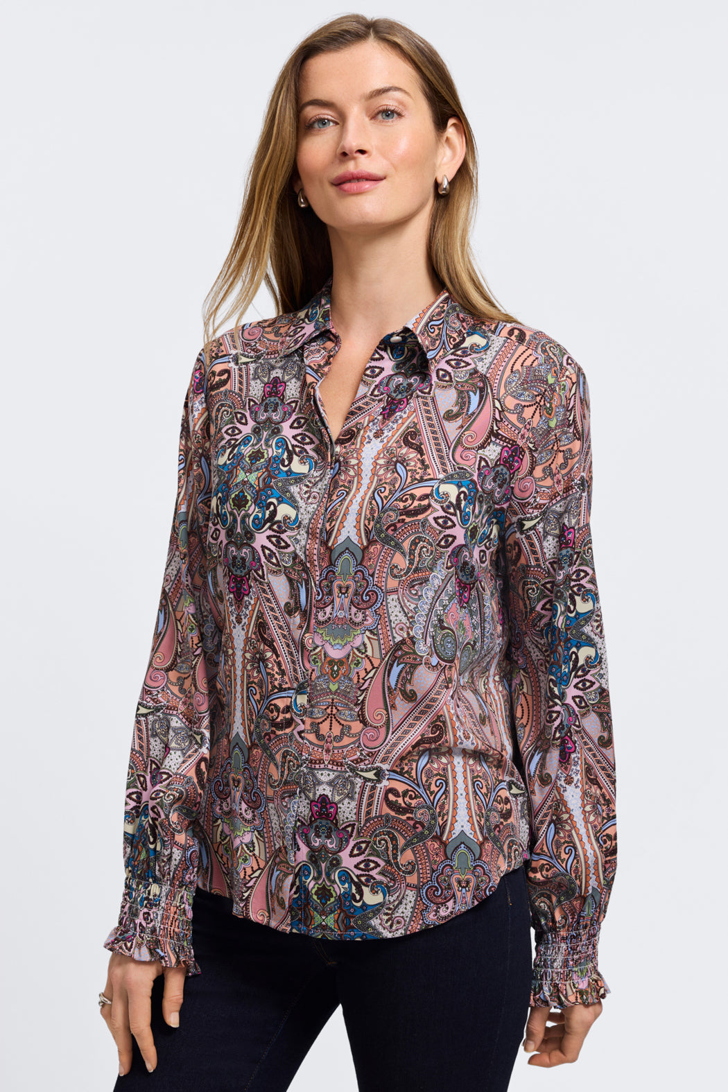 Make a bold statement with this Olivia shirt, designed to blend timeless elegance with modern flair. Featuring a rich mix of colors in an intricate scarf-inspired paisley design, this blouse is the perfect choice for adding personality to your wardrobe. Its buttery soft tencel rayon twill fabric drapes beautifully, while the button-front style and classic collar offer a polished, versatile look. Smocked cuffs with subtle ruffle detail bring a touch of femininity, making this shirt ideal for both work and weekend wear. Pair it with jeans for casual chic or tailored pants for a sophisticated ensemble.